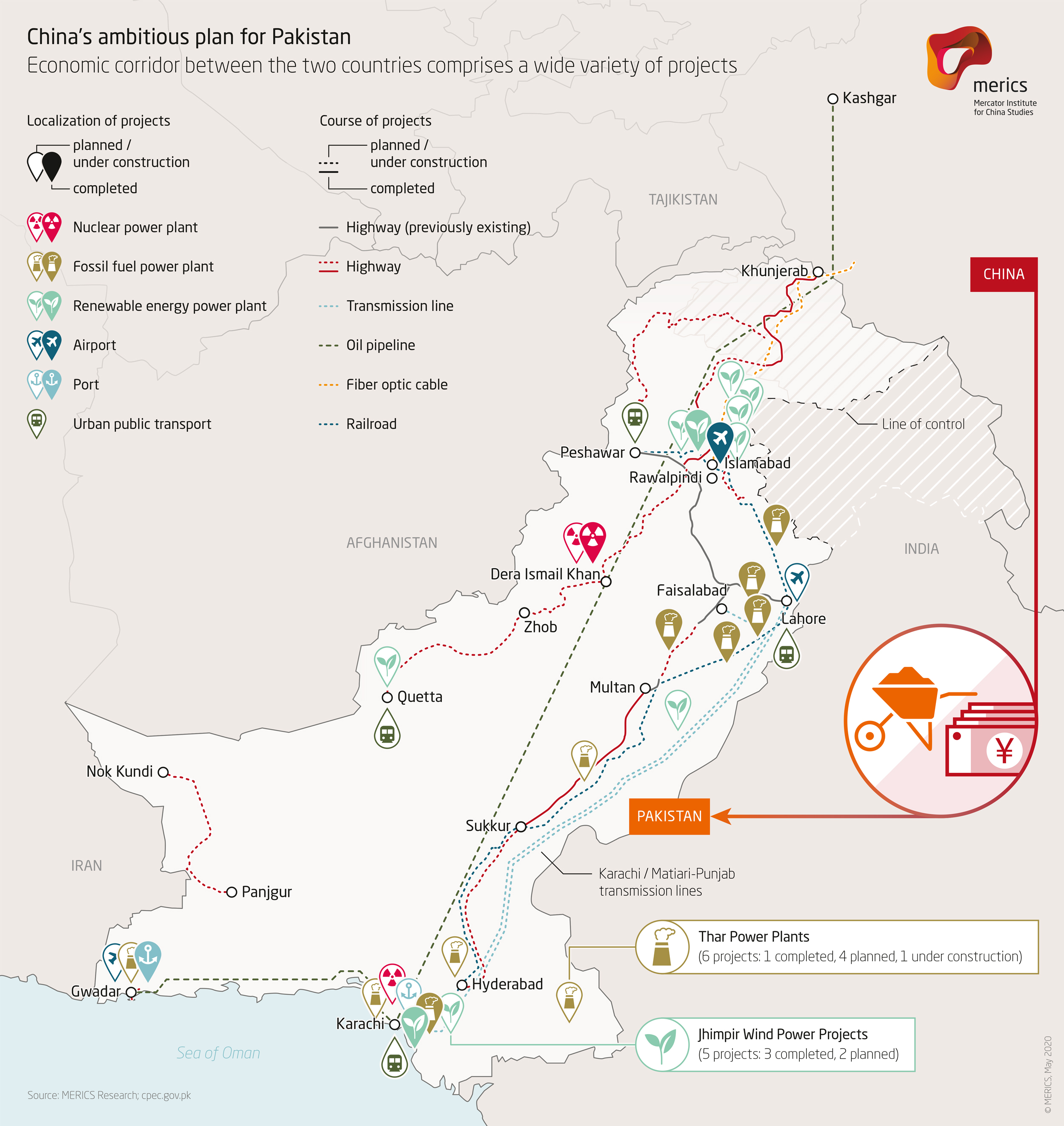 CPEC projects (as listed on this Pakistan government website) constitute the bulk of BRI-related activities in Pakistan, and its stated goals align with those in China’s main BRI policy documents. CPEC, however, does not cover all joint Sino-Pakistani infrastructure efforts that can be seen as furthering BRI goals. CPEC projects, moreover, do not always involve China directly. In line with the methodology behind the MERICS Belt and Road Tracker, we have chosen to include non-CPEC projects when they fall within the range of BRI goals.