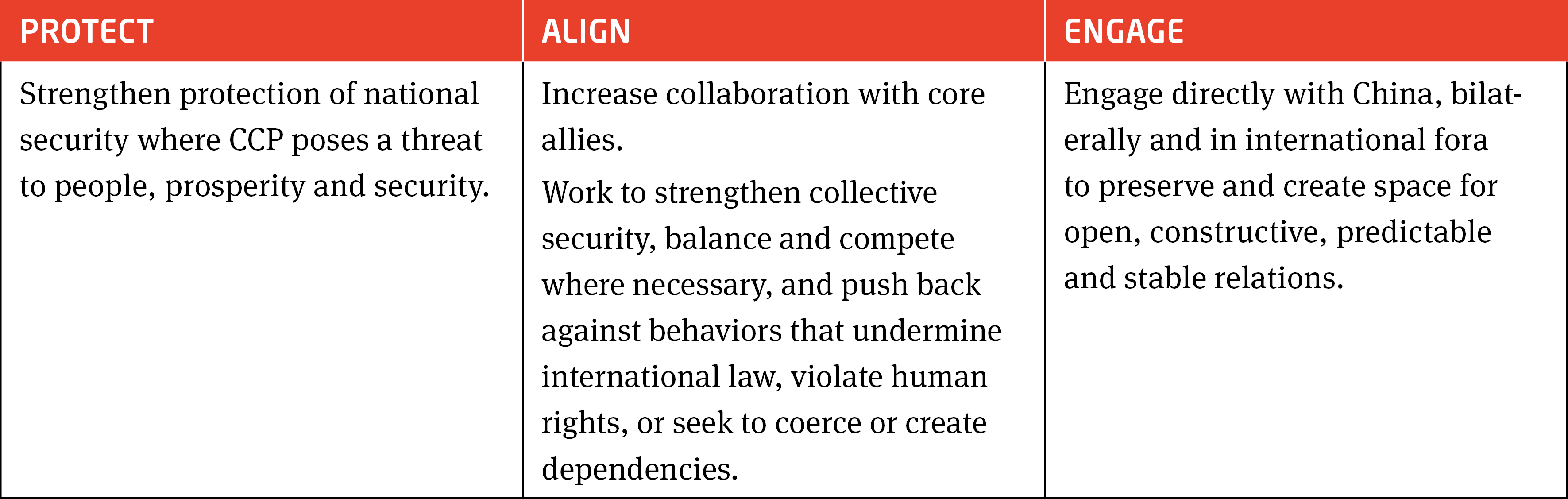 The UK does not have a specific China strategy, but China appears in the Integrated Review of Security, Defence, Development and Foreign Policy (2021) which was itself reviewed in 2023 as the Integrated Review Refresh. The 2021 Integrated Review identified China as a systemic competitor to the UK, but there was still a strong call for openness and collaboration. In the Integrated Review Refresh, China became an epoch-defining and systemic challenge, while still leaving space for collaboration. The official approach of the UK to China is three-fold: protect, align, engage.