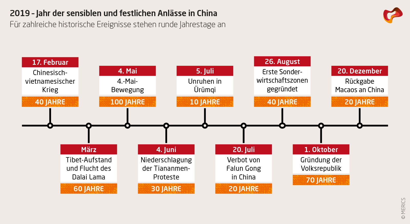 Der 4. Juni ist nicht der einzige heikle Jahrestag, der China 2019 bevorsteht: Am 10. März steht der 60. Jahrestag des Tibet-Aufstandes 1959 an, in dessen Folge der Dalai Lama aus seiner Heimat floh. Aus friedlichen Gedenkkundgebungen zur Erinnerung an diesen Aufstand entspannen sich 2008 in Tibet gewalttätige Unruhen. Im April ist es genau 20 Jahre her, dass Falun Gong in China verboten wurde, zahlreiche Mitglieder der Bewegung wurden systematisch verfolgt. Vor zehn Jahren dann brachen in Ürümqi, der Hauptstadt der Autonomen Region Xinjiang, Unruhen aus. Auch das anstehende Jubiläum 30 Jahre Mauerfall und weitere Jahrestage im Zusammenhang mit dem Zusammenbruch der Sowjetunion sind Anlass für Beunruhigung in Beijing.