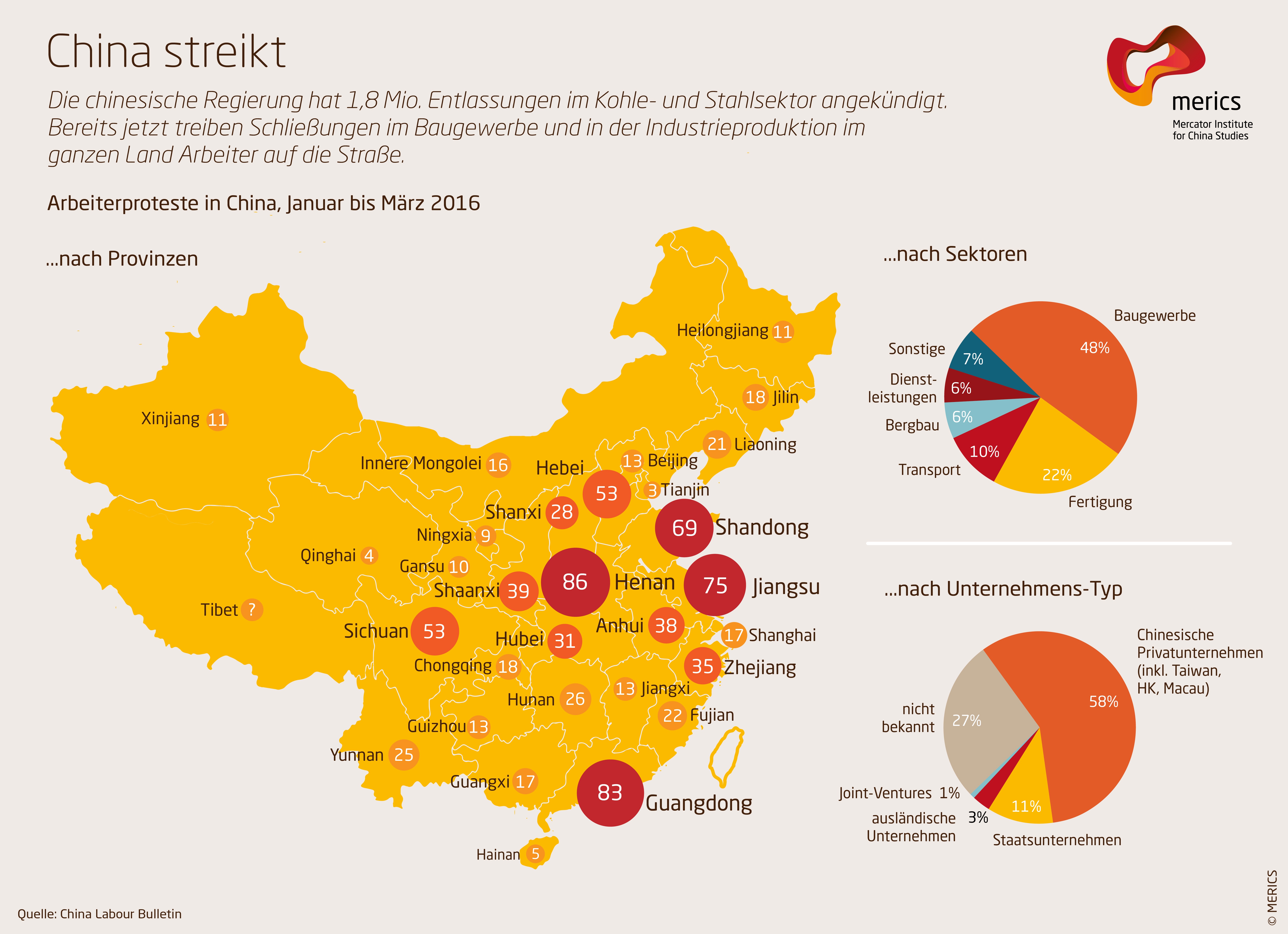 Bei den meisten bekannt gewordenen Vorfällen handelt es sich, wie die Grafik für die proteststärksten Provinzen Henan, Guangdong und Jiangsu zeigt, vornehmlich um die Proteste entlassener Arbeiter von Privatunternehmen im Bau- und Produktionsgewerbe. Ein erneuter Anstieg der Proteste im Laufe des Jahres ist zu erwarten.