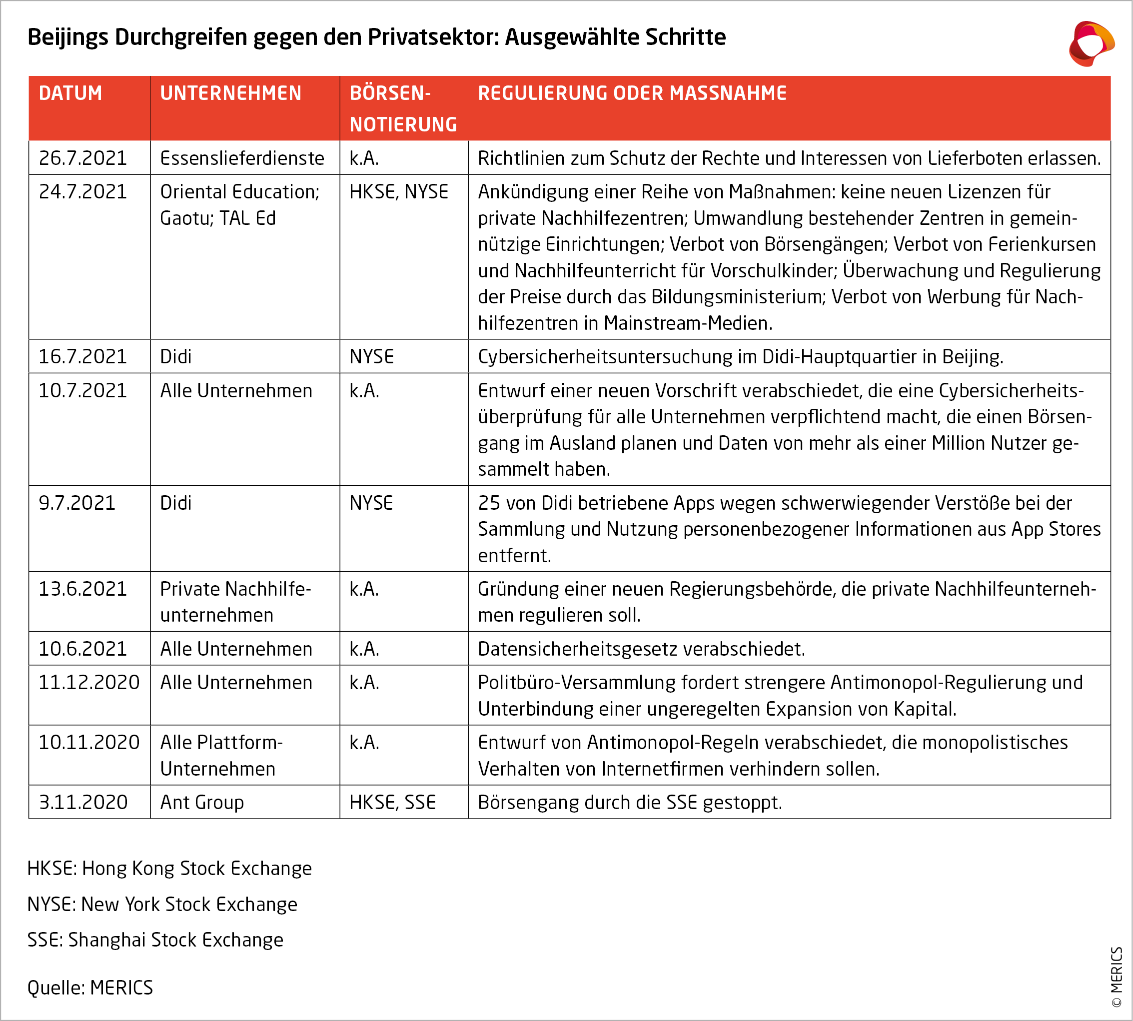 MERICS-Analyse: Die chinesische Regierung versucht, vom Wirtschaftswachstum als Hauptquelle ihrer Legitimität abzurücken und konzentriert sich stattdessen auf die Beseitigung der Ursachen für die Unzufriedenheit in der Gesellschaft. Außerdem will sie ihre Kontrolle über die Privatwirtschaft festigen und sicherstellen, dass diese eher der politischen Agenda der Partei als ihren eigenen wirtschaftlichen Interessen dienen. Im Vorfeld des Parteitags 2022 könnte es als politisch nützlich angesehen werden, diese populären Schritte zu verfolgen – selbst auf Kosten von Aktionären und Wohlhabenden – insbesondere, wenn Xi Jinping und seine Getreuen ihre Positionen behalten wollen.