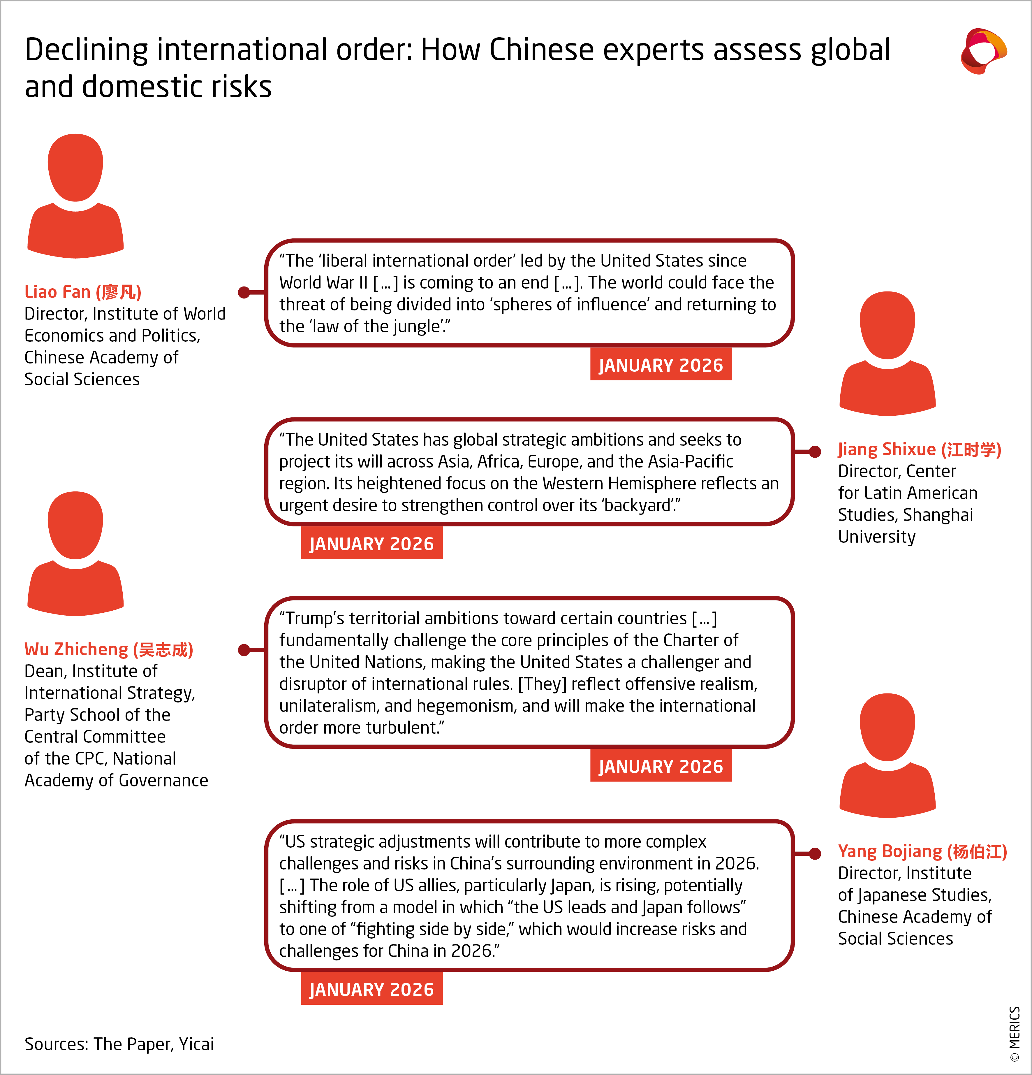 Rather than seeing the attack on Venezuela as evidence of US retrenchment, many Chinese experts read it as a first step towards establishing global – and therefore also Indo-Pacific – dominance. Chen Wenxin (陈文鑫), Director of the Institute of American Studies at the China Institutes of Contemporary International Relations, for example, describes Venezuela as a “stepping stone for practicing US hegemony.” Yang Bojiang (杨伯江), Director of the Institute of Japanese Studies at the Chinese Academy of Social Sciences, explains that US strategic adjustments would create complex regional challenges and risks that directly interfere with Chinese power claims in the Indo-Pacific: “Although the United States claims to focus on the Western Hemisphere, it will not abandon Taiwan or Japan as pillars of its Indo-Pacific strategy.”