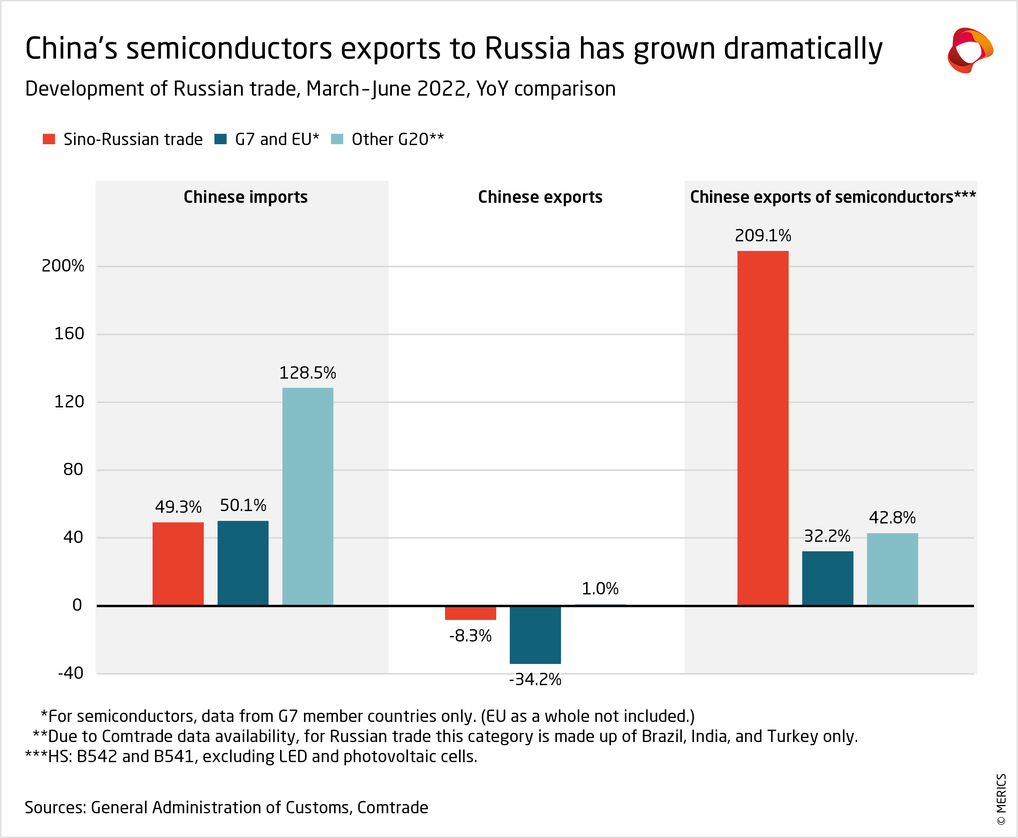 Chinese exports to Russia plummeted following the outbreak of war, but have since rebounded. In contrast to EU and US exports, this initial slowdown was most likely due to the weakness of the Russian economy. China nevertheless outperformed all non-OECD G20 peers including Brazil and India, although Turkey is suspected of circumventing the sanctions. Only chemicals, plastics, and semiconductor exports bucked the downward trend. China has, however, been selective in meeting Russia’s tech needs to avoid being hit by OECD sanctions.