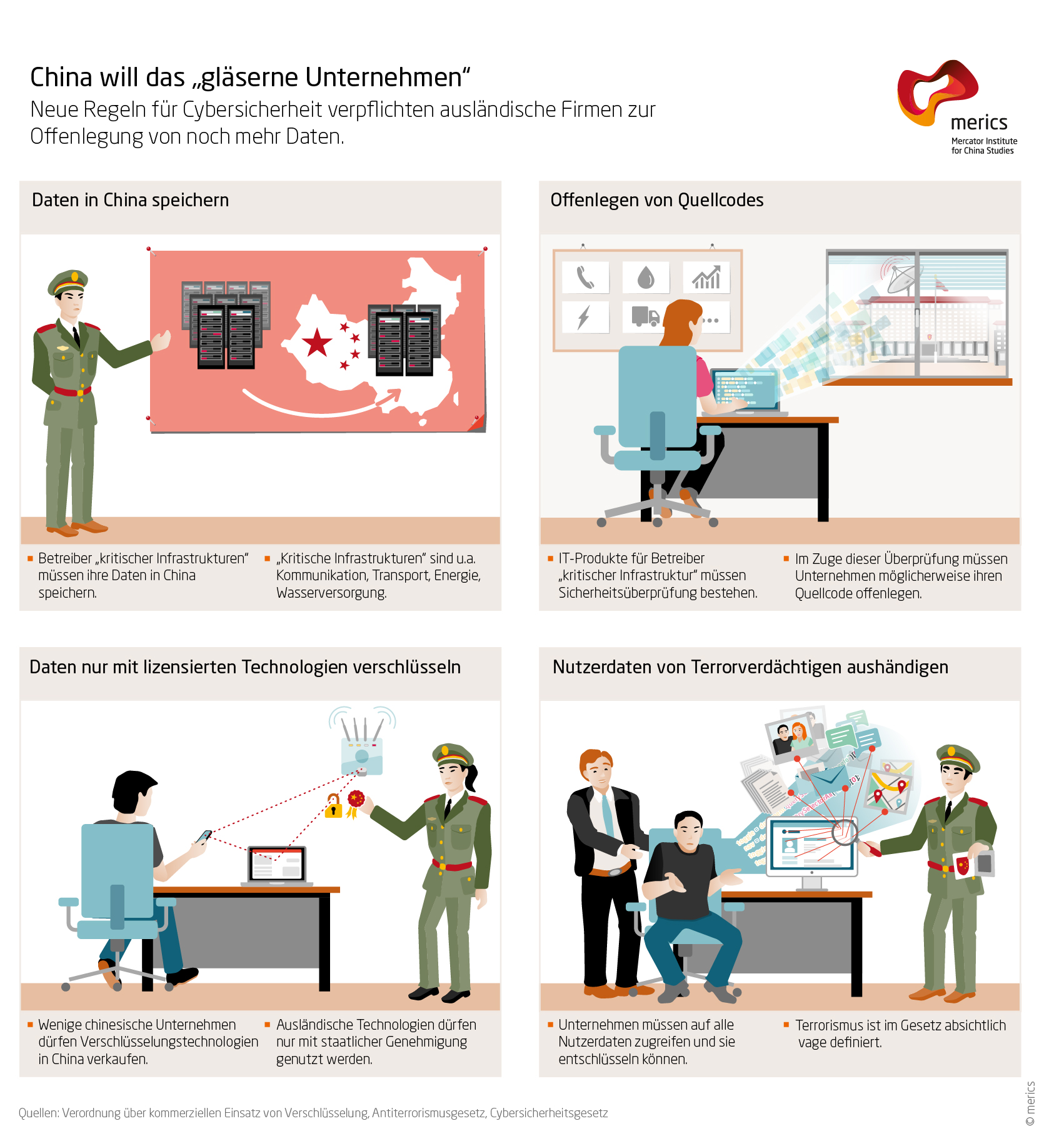 Mit Blick auf die bislang veröffentlichten Regulierungen lassen sich vier konkrete Herausforderungen für ausländische Unternehmen in China ausmachen. Erstens müssen laut dem Cybersicherheitsgesetz von 2016 IT-Produkte für Betreiber der sogenannten Kritischen Infrastrukturen (关键信息基础设施) eine staatliche Sicherheitsprüfung bestehen. Wie weit die Prüfung gehen wird, ist derzeit unklar. Ausländische Unternehmen könnten gezwungen sein, ihre Quellcodes offenzulegen.