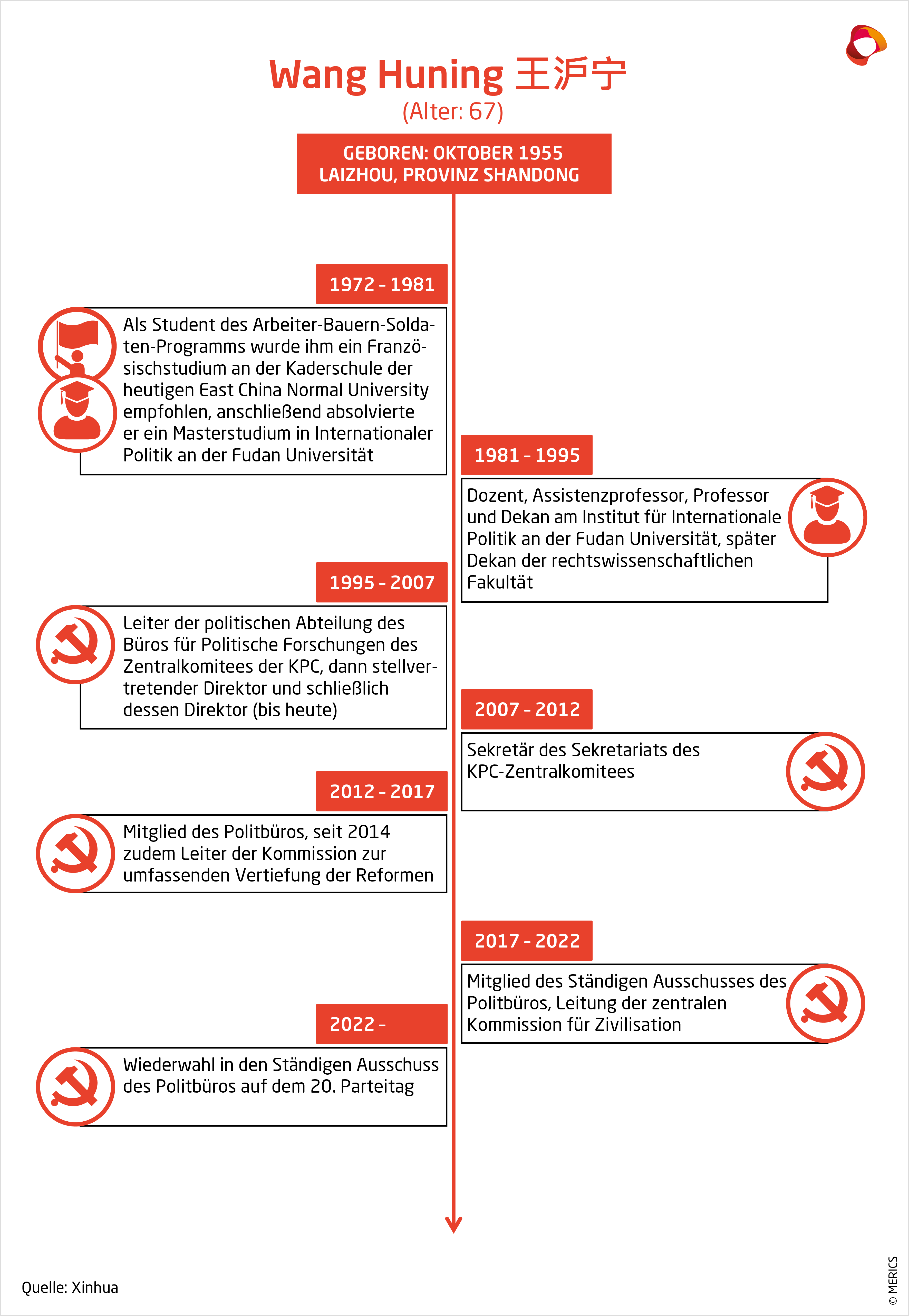 Der oft als belesener Philosoph beschriebene Wang hat als einziges Mitglied des Ständigen Ausschusses keine praktische Erfahrung mit der Leitung einer Stadt oder Provinz als Bürgermeister oder Parteisekretär. Doch der Einfluss des ehemaligen Professors der Fudan-Universität auf Xi und die KPC ist bemerkenswert. Wang leitet zwei wichtige Zentrale Führungsgruppen für den Aufbau der Partei und Ideologie. Regelmäßig begleitet er Xi auf Reisen.