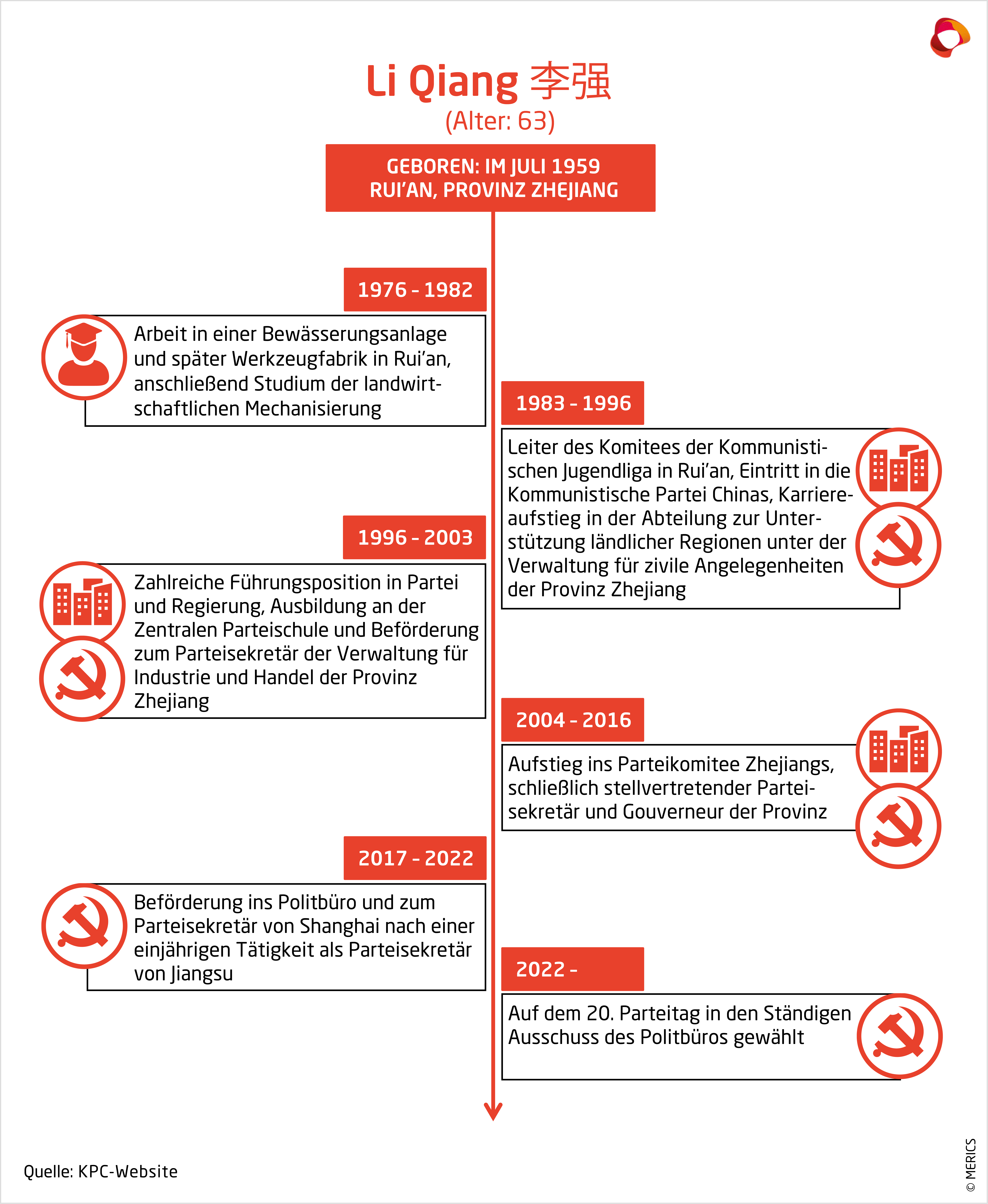 Die politische Laufbahn von Li Qiang, bis vor kurzem Parteisekretär von Shanghai, hat einen neuen Höhepunkt erreicht - trotz seiner Schwierigkeiten, die Corona-Welle in Shanghai vergangenen Sommer in den Griff zu bekommen. Li gilt als einer der engsten Verbündeten von Xi Jinping und ist nun in den Ständigen Ausschuss des Politbüros aufgestiegen. Er wird zudem der nächste Ministerpräsident Chinas. Er gilt als geschäftsfreundlicher, zupackender Manager, wird sich aber jetzt, da er im Ständigen Ausschuss des Politbüros sitzt, viel stärker an den zentralen Parteizielen orientieren müssen, d. h. den Prioritäten von Xi Jinping.