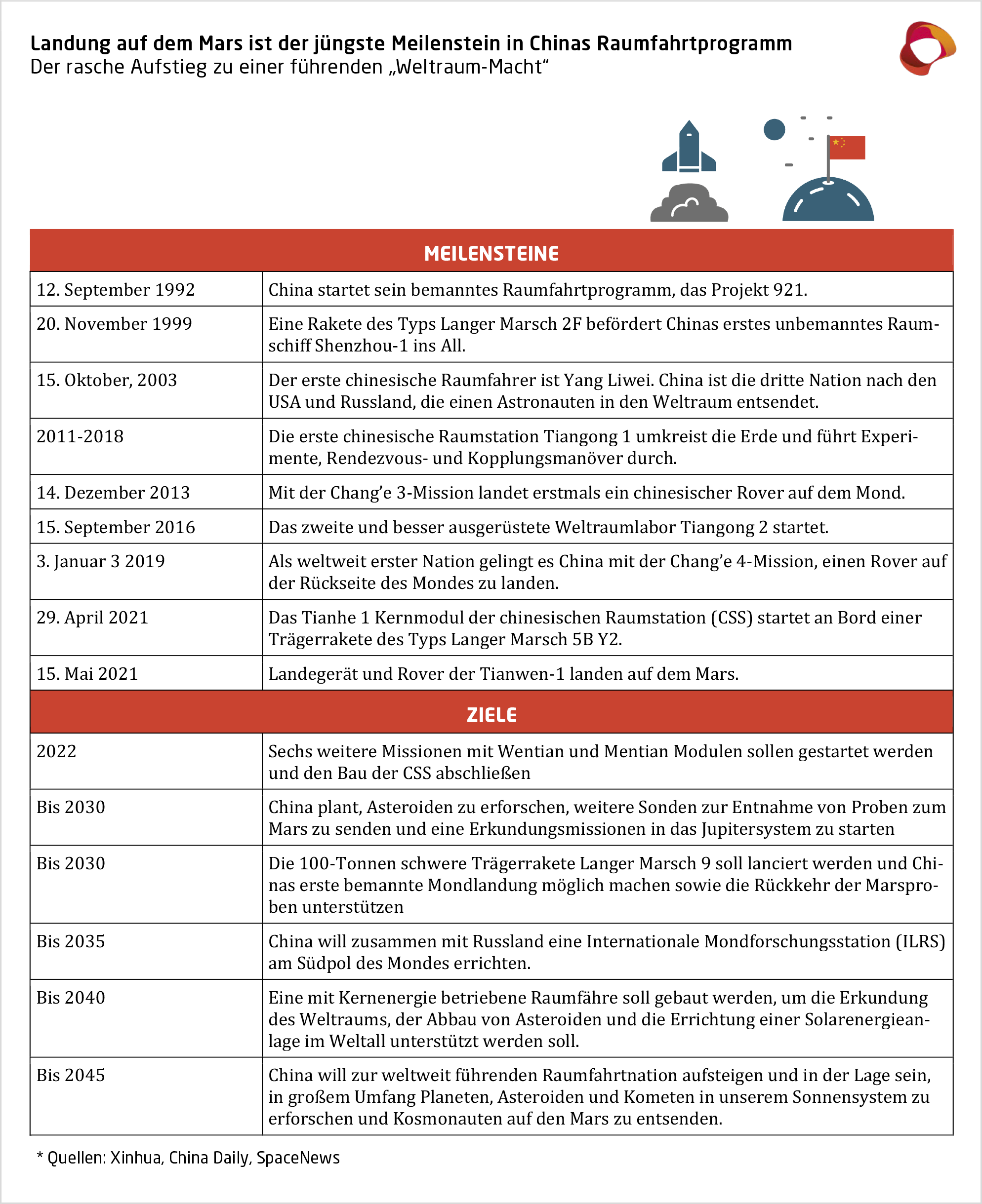 Mit dem erfolgreichen Absetzen eines Erkundungsfahrzeugs auf dem Mars ist China seinem Ziel einen großen Schritt näher gelangt, "eine Weltraum-Macht in vollem Umfang" zu werden. Beijing will die wissenschaftlichen, ökonomischen, militärischen und diplomatischen Vorteile seines Raumfahrtprogramms nutzen, das zugleich eine wichtige Quelle des Nationalstolzes und zentral im Wettstreit mit den USA ist.