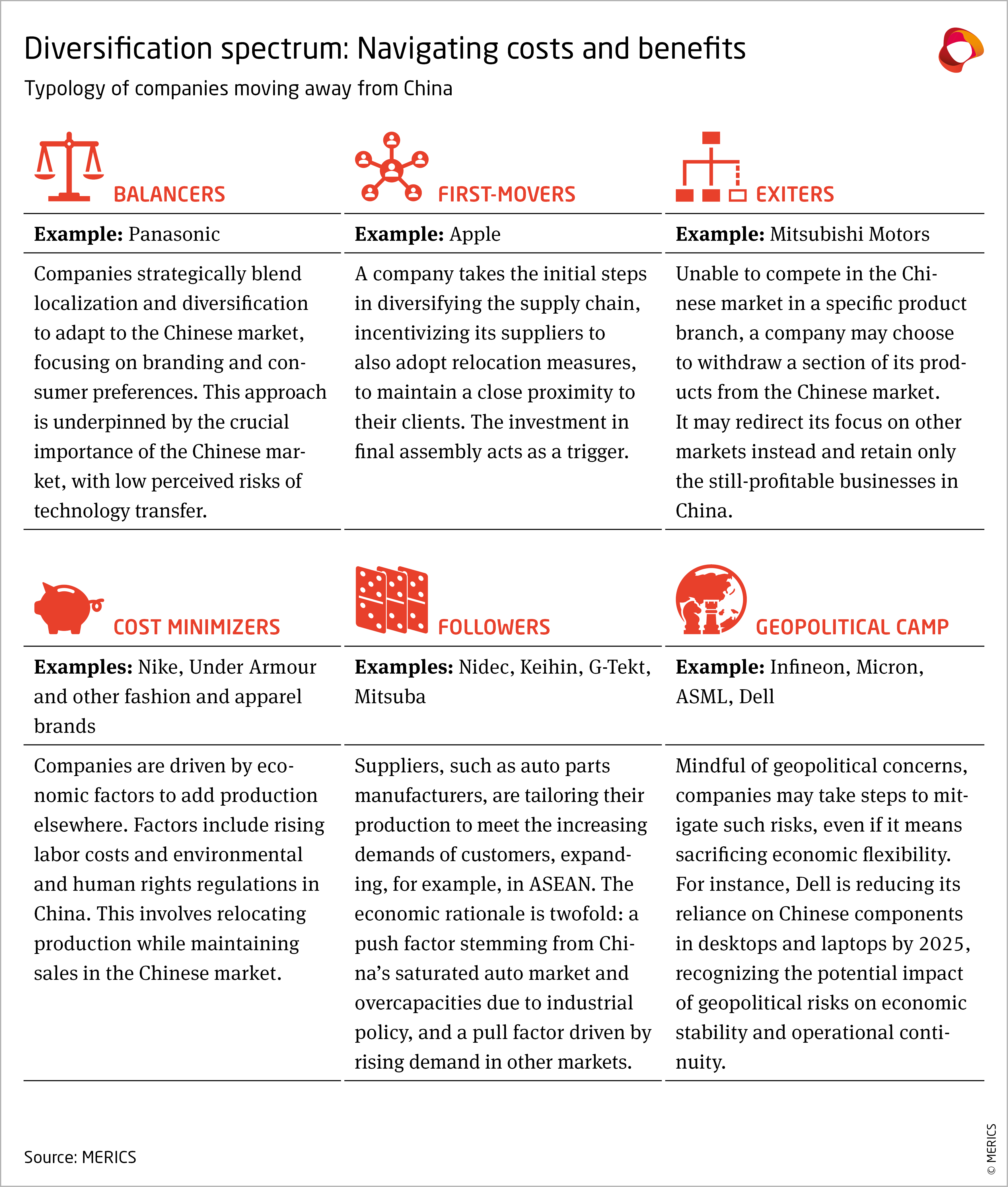 Finally, non-economic considerations drive entities within the geopolitical camp. Semiconductor and computer producers like Infineon and Dell have recalibrated their dependencies on Chinese components, aware of the intricate nexus between geopolitical uncertainties and economic risks. This and the five other types encapsulate the nuanced strategies essential for navigating the dynamic contours of China's economic evolution.