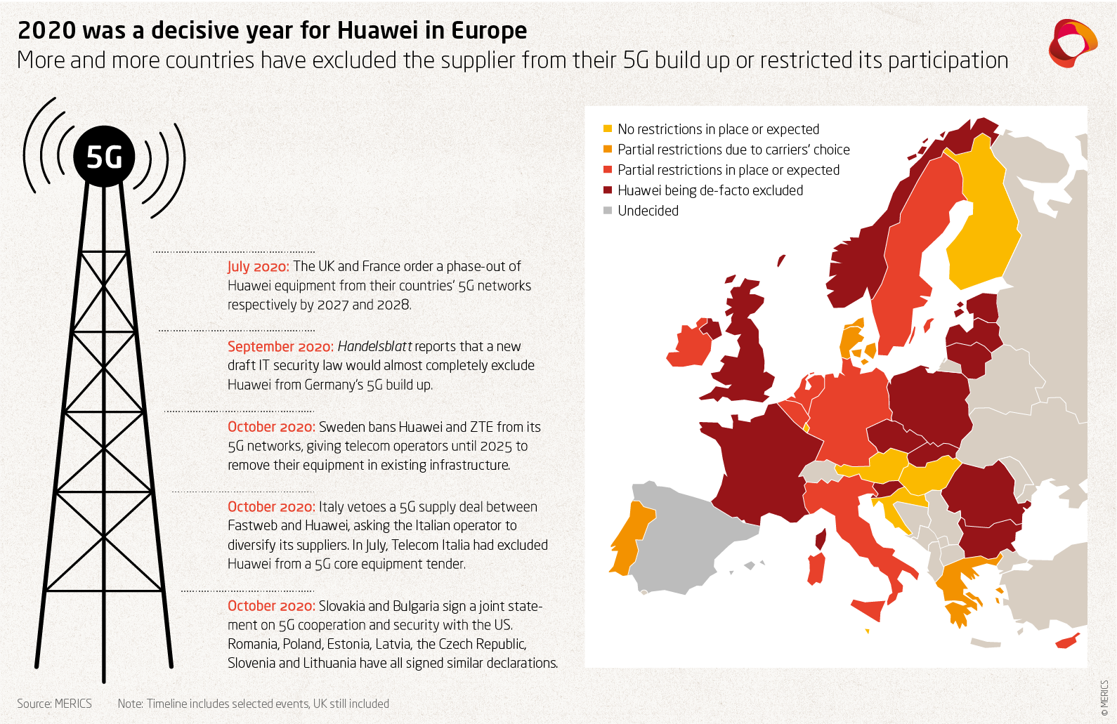In 2020, most European governments restricted Huawei’s participation in the rollout of their countries’ 5G networks. Approaches vary from blanket bans in the UK and Sweden, to tighter regulatory frameworks which de facto discourage operators from using Huawei technology, like in Italy. A number of European countries have also signed onto the US’ Clean Network Initiative, affirming their commitment to only allow trusted vendors in their fifth-generation infrastructure. This is the case for Poland, Romania, and other countries in eastern Europe. Meanwhile, debates about security risks involved in working with organizations linked to the Chinese party-state have extended to other areas of EU-China relations, such as cooperation in research and innovation.