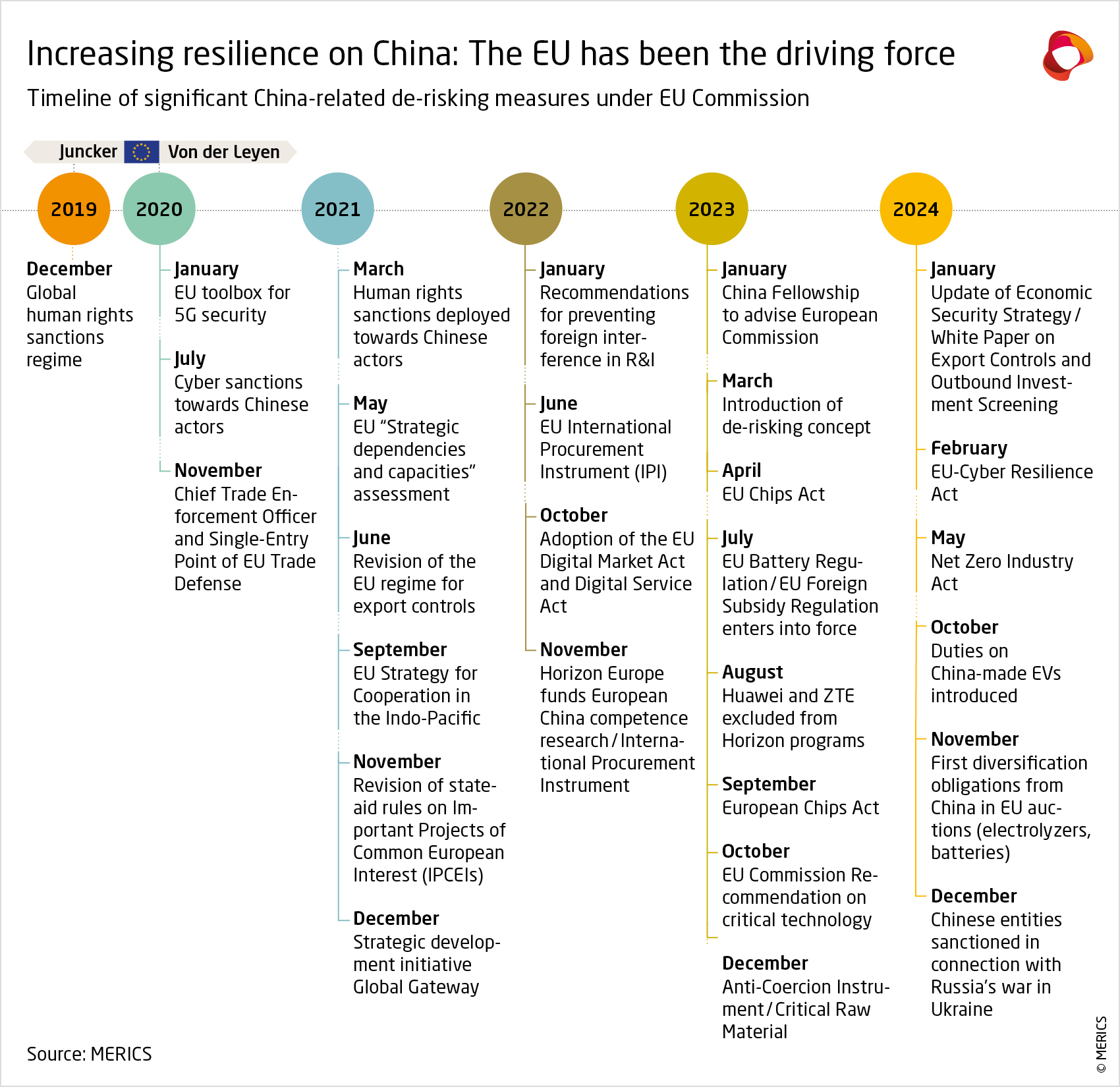 In response, the European Union has adapted and expanded its policies for responding to economic threats caused by geopolitical uncertainties in general and the challenges posed by China in particular. In 2023, the European Commission announced a European economic security strategy. That same year, the EU’s new anti-coercion Instrument, aimed at countering economic pressure from other countries, and its Foreign Subsidies Regulation (FSR), designed to address market distortions, came into force. A year later, the Commission proposed a revision of the FDI screening regulation to enhance scrutiny of foreign direct investments.