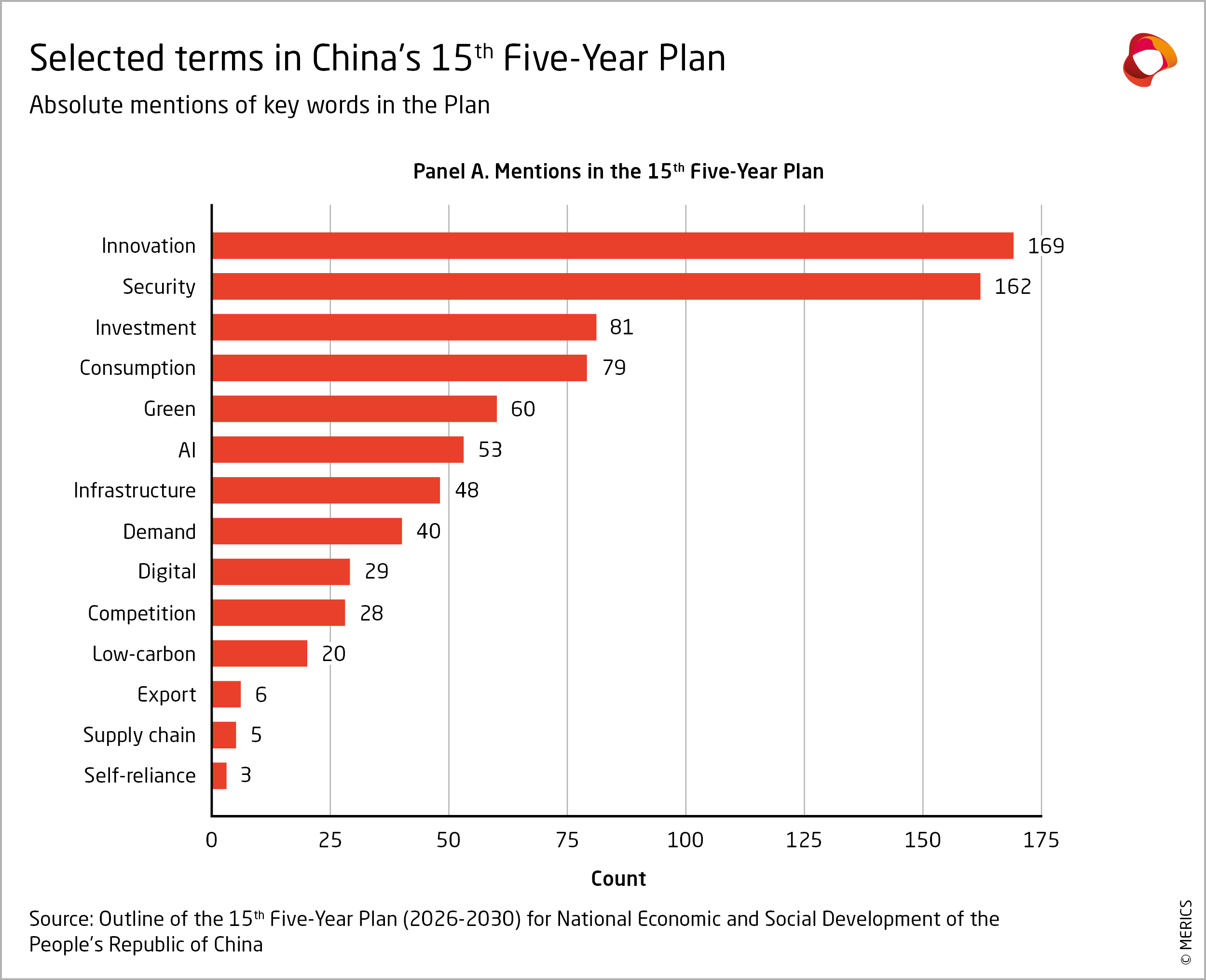 Domestic demand is expected to play a more significant role in driving economic growth than over the last five years. But the 15th FYP makes also clear that China aims to remain a manufacturing powerhouse along the entire economic value chain, neither relinquishing downstream sectors like consumer goods nor upstream ones like rare earths. Control over value chains is seen as way to increase economic resilience and geopolitical power. While expanding trade is certainly a goal, national security and economic de-risking are the main drivers of supply-chain control, alongside industrial upgrading and the transition to renewable energy.