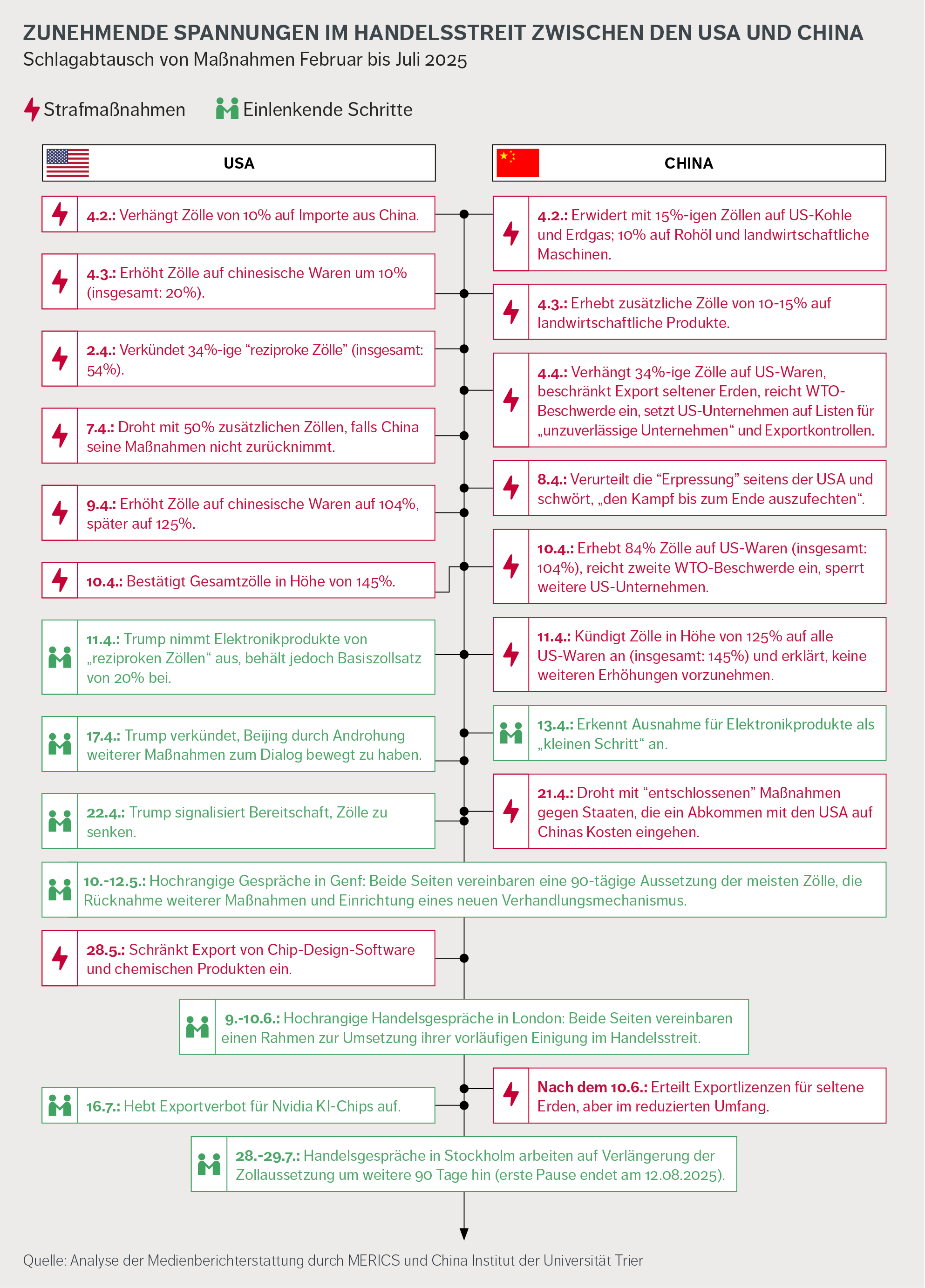 China und die USA befinden sich in einem erbitterten Handelskonflikt. Seit Februar 2025 spitzte sich die Situation zu, mit beidseitigen Ankündigungen von Zöllen in schwindelerregender Höhe und einer Reihe von weiteren Maßnahmen (siehe Grafik). Hochrangige Gespräche im Mai, Juni und Juli in Genf, London und Stockholm brachten eine vorübergehende Schonfrist, mit ungewissem Bestand. Beide Seiten nahmen die Ausfuhr wichtiger Produkte wieder auf. Eine Reihe von Zöllen soll jedoch beibehalten werden, und Washington und Beijing werfen einander vor, gegen die Vereinbarungen zu verstoßen.