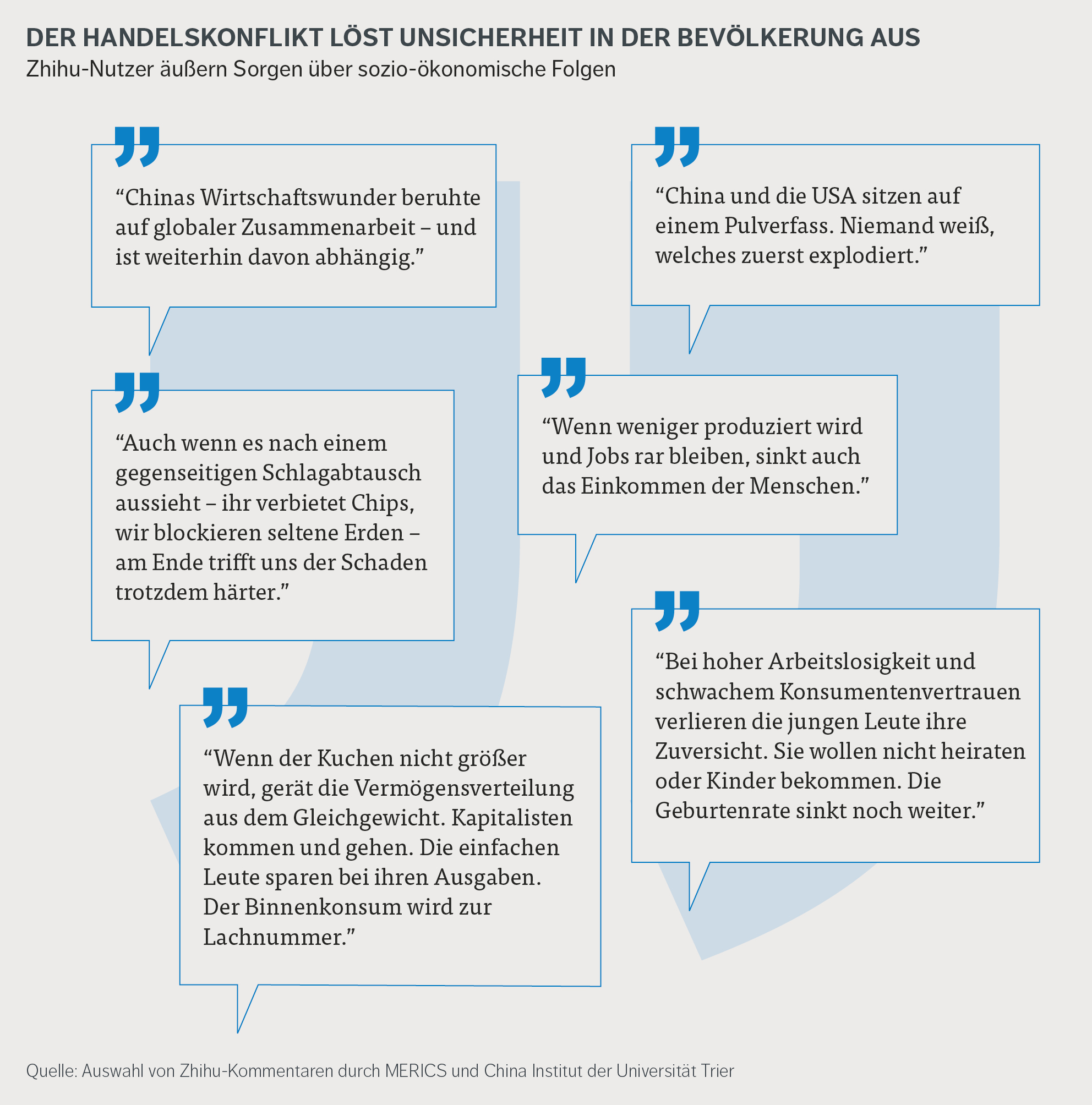 Die Zhihu-Debatten zeigen aber auch die Ängste und Sorgen der Menschen über mögliche Auswirkungen auf die Wirtschaft und den Arbeitsmarkt. Einige Kommentatoren bezweifeln, dass China in der Lage sein wird, seine Produkte im bisherigen Umfang im Ausland abzusetzen, Bedenken, die denen chinesischer Wirtschaftswissenschaftler:innen ähneln. Eine hohe Arbeitslosigkeit, zunehmende Ungleichheit oder gar Gefahren für die soziale Stabilität und die demografische Entwicklung identifizieren sie als mögliche Folgen für China.