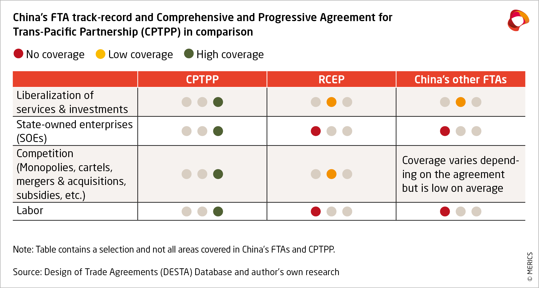 The skeptics are right that CPTPP’s goals for the liberalization of services and investment, and market regulation to ensure competition and open public procurement stands in contrast to China's track record with other free trade agreements (FTAs). CPTPP is considered one of the most technical agreements of this type, with high standards, including substantial environmental and labor provisions, transparency requirements and an unparalleled scope for liberalization. The commitments China has agreed to in order to seal the RCEP and other FTAs are below the levels of coverage of the CPTPP (see table).