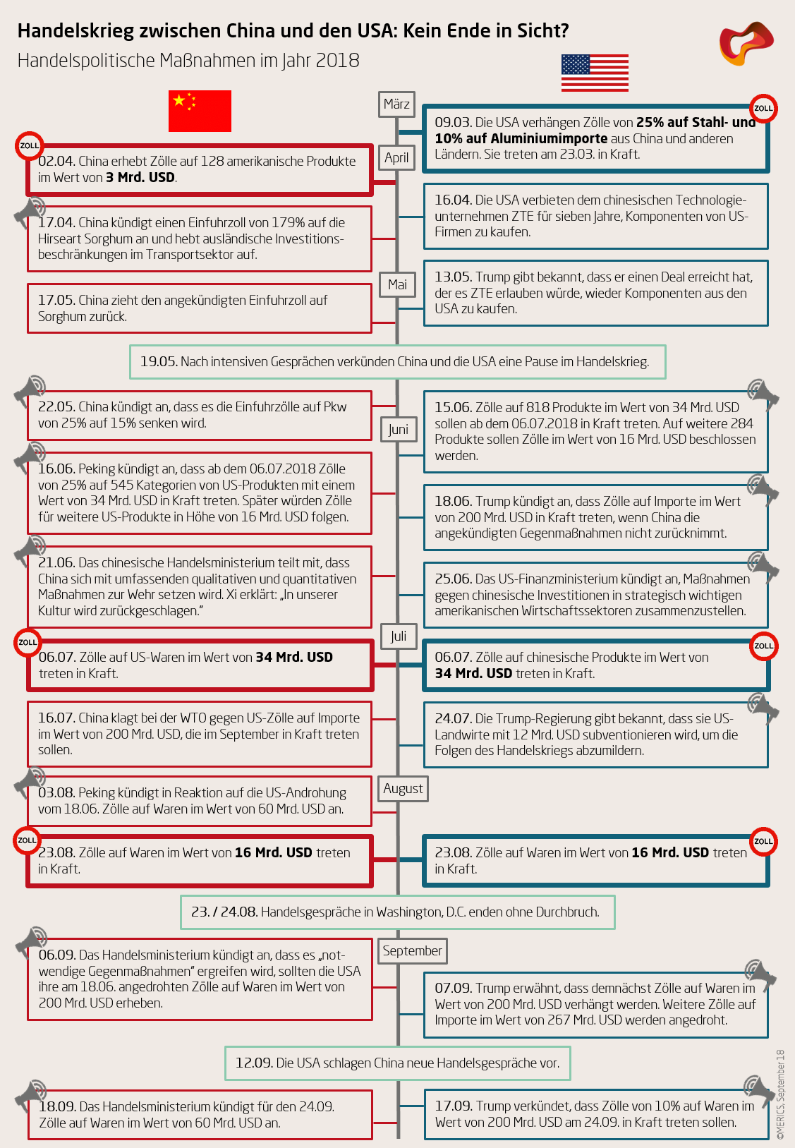 Die Handelsbeziehungen zwischen China und den USA haben in diesem Jahr bereits zahlreiche Wendungen genommen. So feuerte die Regierung von Präsident Trump im Januar den ersten Schuss ab, als sie Strafzölle von 30% auf chinesische Solarpaneele und Waschmaschinen verhängte. Sie löste damit einen erbarmungslosen Handelskrieg aus. Die Entscheidung der USA, weitere Zölle auf Stahl- und Aluminiumprodukte zu erheben, führte zu ersten Vergeltungsmaßnahmen von Seiten Chinas. Während des Sommers lieferten sich die USA und China einen Schlagabtausch. Anfang September war der Konflikt so eskaliert, dass Trump Importzölle auf alle chinesischen Importe androhte. Schließlich aber verkündete die US-Regierung am 12. September, dass eine neue Verhandlungsrunde angestrebt werde, bevor weitere Zölle auf chinesische Importe im Wert von 200 Milliarden US-Dollar erhoben würden.