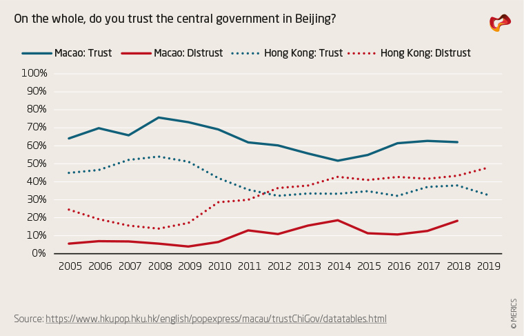 It seems unlikely, however, that Hongkongers will comply. Too much distinguishes the two SARs from one another: Unlike Hong Kong, pro-CCP groups have controlled and influenced Macau for over half a century. What's more, Macau’s citizens not only identify more strongly with the PRC but are also more trusting of Beijing.