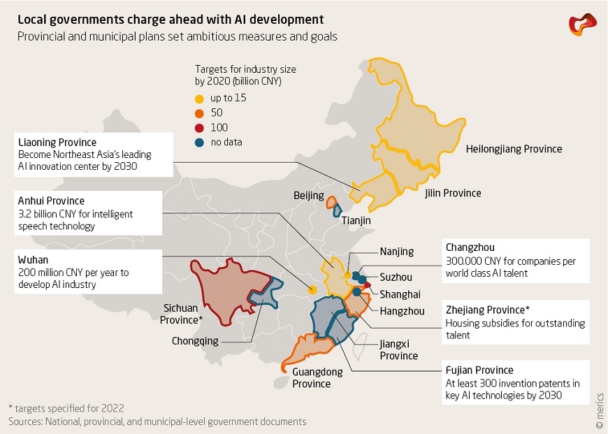 China is determined to become the globally-leading innovation center for Artificial Intelligence (AI). National industrial policies to promote AI are implemented at top speed at local and provincial level. In some cases, the local goals even exceed the national ambitions.