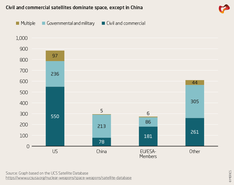 In a trend known as “New Space" private space enterprises are proliferating everywhere. Two thirds of US satellites today serve civil or commercial applications. In the EU, too, civil and commercial satellites dominate. In contrast, of four Chinese satellites, only one is used for civil and commercial use; the other three satellites are deployed for governmental and military applications.