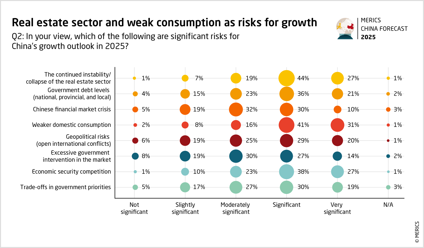 While Xi Jinping’s government last year took some steps to address the Chinese economy’s structural problems, a clear majority of the experts and observers MERICS polled still saw these as the key economic issues going into 2025: Some 73 percent said weak consumer demand posed “significant” or “very significant” risks to the economy, while 71 percent said the same of real-estate market problems, and 57 percent of excessive national, provincial and local government debt levels that have weakened public spending and financial stability.