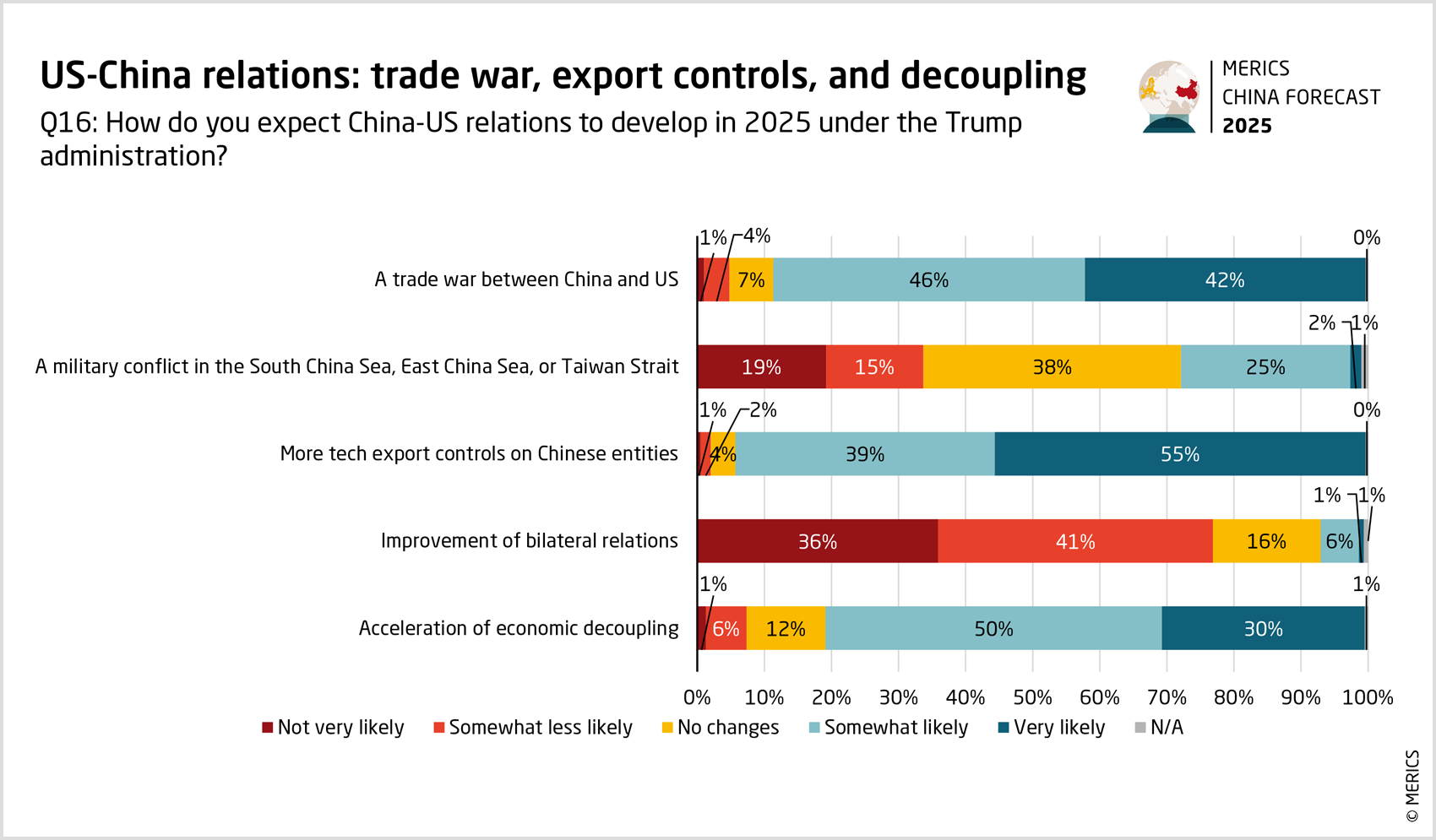 More US export controls on high-tech products bound for China are seen as “very likely” or “somewhat likely” by 94 percent of respondents, with a clear majority stating the former. With an all-out trade war between the US and China seen as “very likely” or “somewhat likely” by 88 percent of our poll, some 80 percent said the economic decoupling would likely accelerate in 2025. While Joe Biden sought to lower economic interdependence on national-security grounds, Trump also wants to address trade imbalances and protect US jobs.