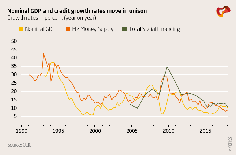 Historical data for GDP, money supply and 'total social financing' (the Chinese government's own measure of total credit in the economy) show credit and GDP moving in unison. They also show that the two measures of credit have grown faster than GDP.