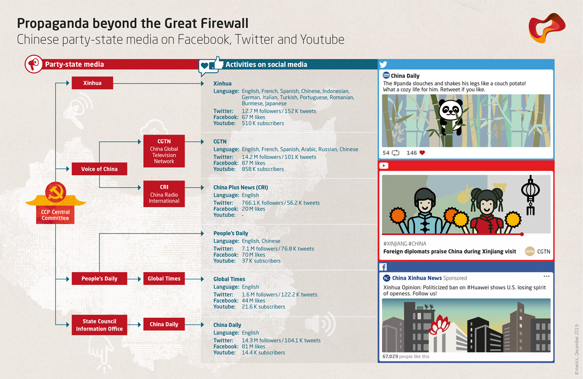 Although Facebook, Twitter and YouTube are blocked in China, Chinese party-state media have built very active presences on these platforms. Lately, Chinese ambassadors around the world have been opening Twitter accounts to feed their government’s positions into global debates on China. Even though the propaganda may seem crude and inefficient at first sight, its long-term effects should not be underestimated.