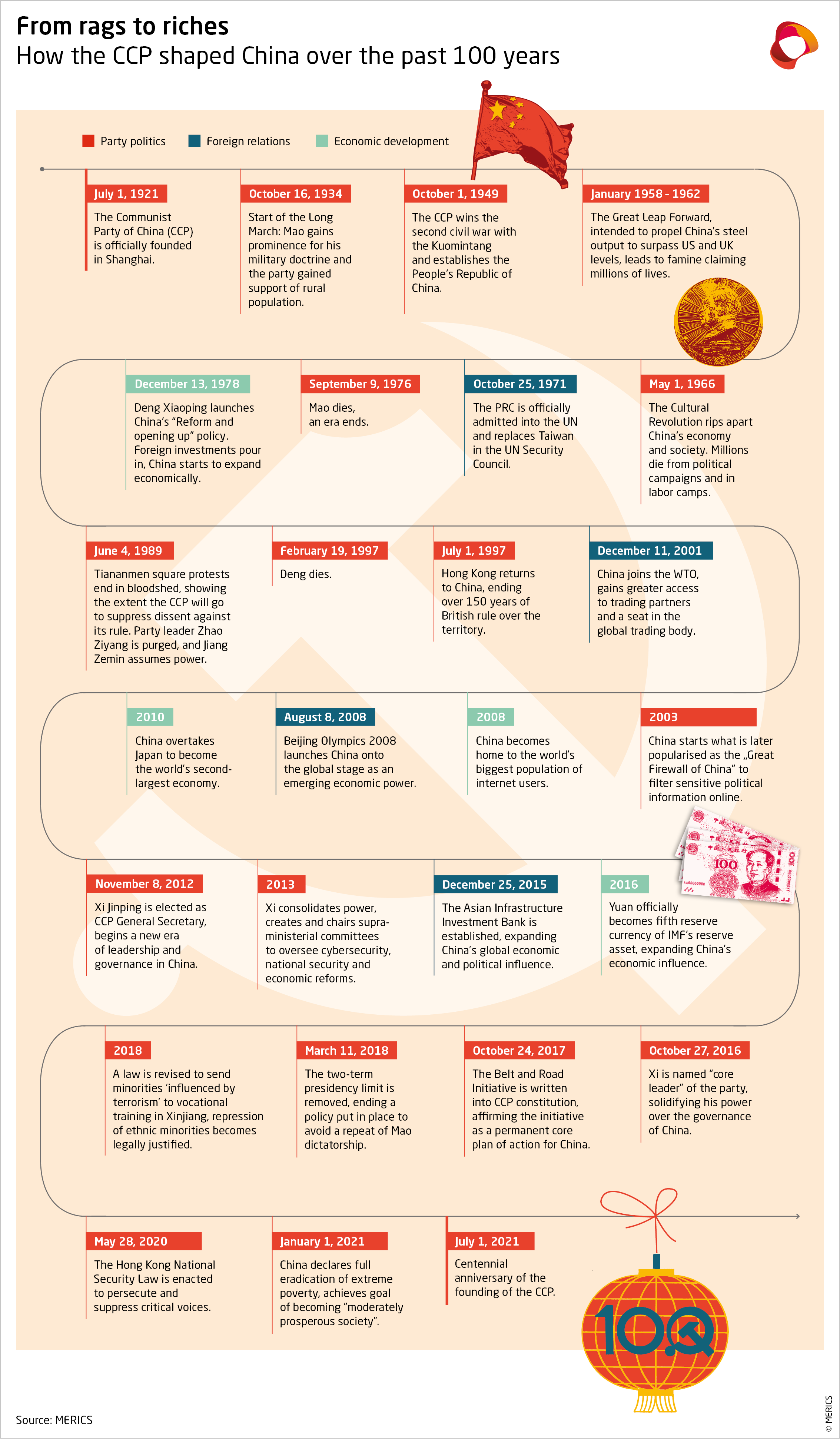 In a century, the Chinese Communist Party (CCP) has transformed itself from an underground rebel movement to one of the most influential and powerful regimes in the world. The timeline traces how the CCP has come to power and expanded its influence domestically, economically and in foreign relations.