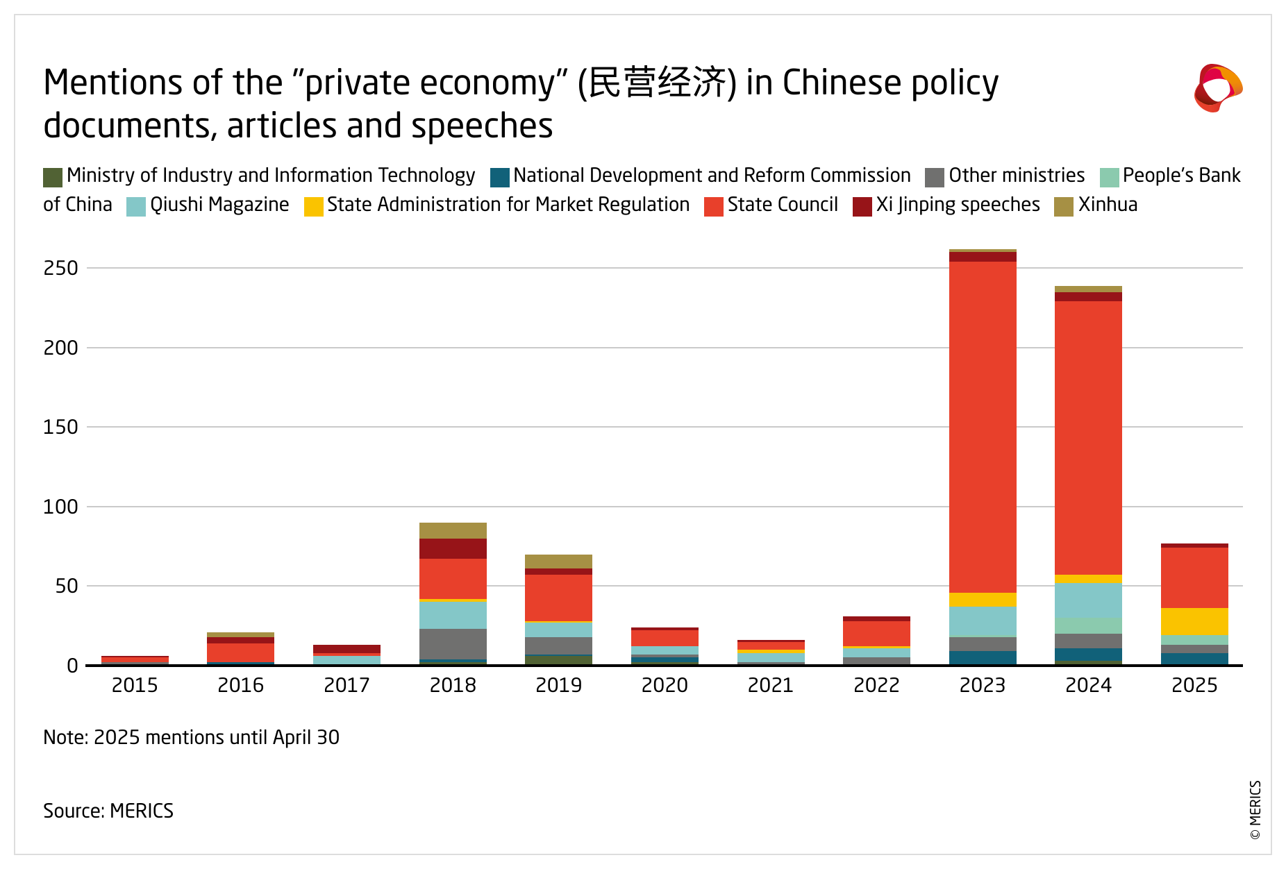 In recent years, private sector confidence has suffered due to geopolitical tensions with the United States, local government campaigns against outdated manufacturing firms (落后产能), and crackdowns by the Chinese Communist Party against the platform economy and the property sector. The PEDBs are part of a wider campaign aimed at bringing new life into China’s private economy. Since 2023, there has been a considerable increase in references to the private economy in official policy documents. In May 2025, the government also passed the first law in China to clearly define the legal status of the private sector.