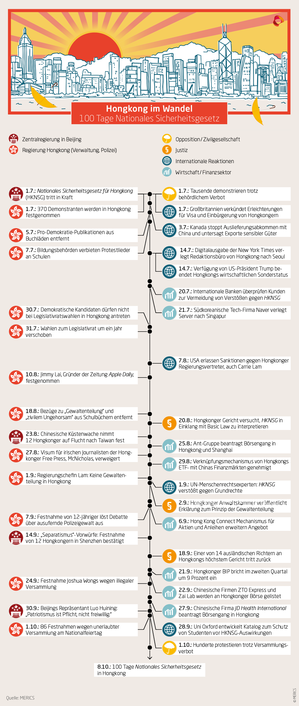 In Beijing’s eyes, the introduction of the much-contested law has been a complete success. It is hailing the law’s efficiency in reestablishing public order in the special administrative region. And indeed, with a little help from pandemic-related restrictions on public assembly, the frequent and, at times, violent pro-democracy protests of the previous year have abated. Those who openly called for independence have fallen silent. Both the Central and Hongkong government argue that the law has ultimately provided a boost for good governance in the city. They still hold that the law only targets an “extremely small minority” of violent offenders – after all, less than 30 people have been arrested so far for violating the HKNSL.
