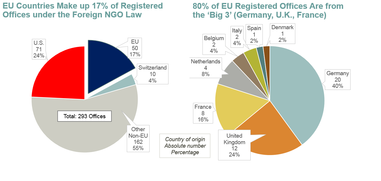 It is worth taking a closer look at the nature of European “non-governmental organizations” (非政府组织) working in and with China to see why it is hard to conceive of the law as a common European problem. Contrary to what descriptions of “Western NGOs”—particularly in Chinese debates—might suggest, the characteristics of these organizations are fundamentally diverse. To start with, only a small minority of EU member states have organizations that have been formally registered so far under the new law, with four out of five coming from the EU’s “Big 3” countries: Germany, the U.K., and France.