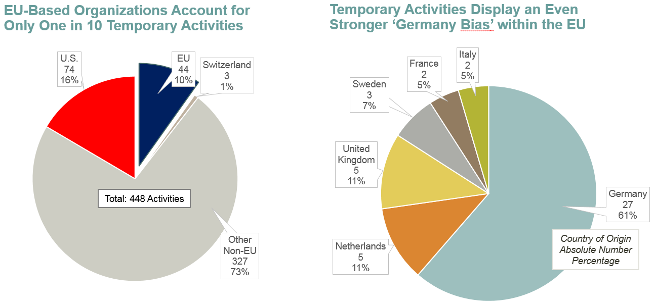 The picture hardly changes when looking at “Temporary Activities” filed under the new law throughout the first year—only that German organizations are even more strongly overrepresented.