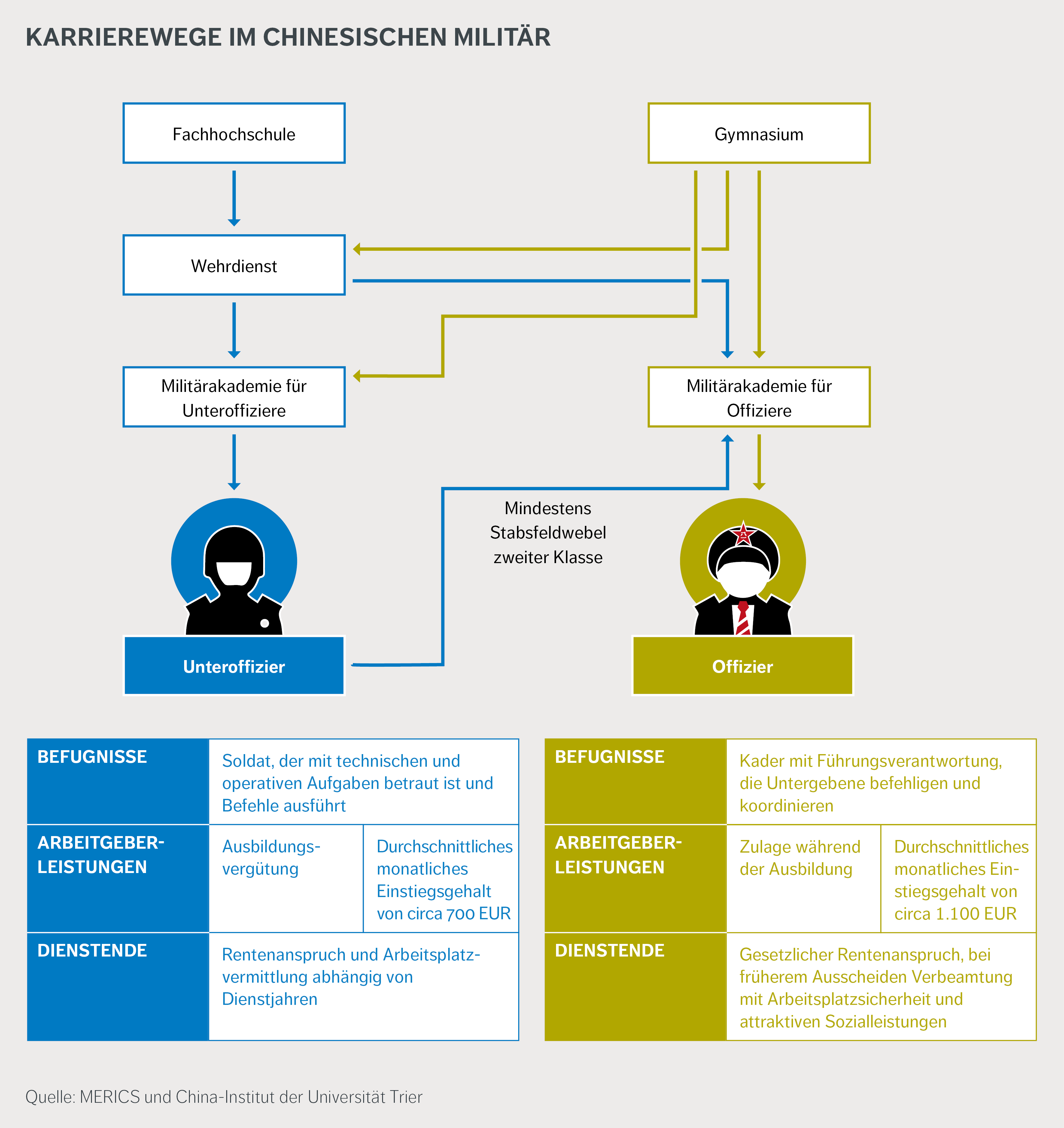 - Praktische und nicht etwa geopolitische oder ideologische Gründe dominieren die Diskussionen über eine Karriere beim Militär. Chinas wirtschaftlicher Abschwung und die zuletzt intensivierten Patriotismus-Kampagnen könnten den Militärdienst für junge Menschen attraktiver machen.