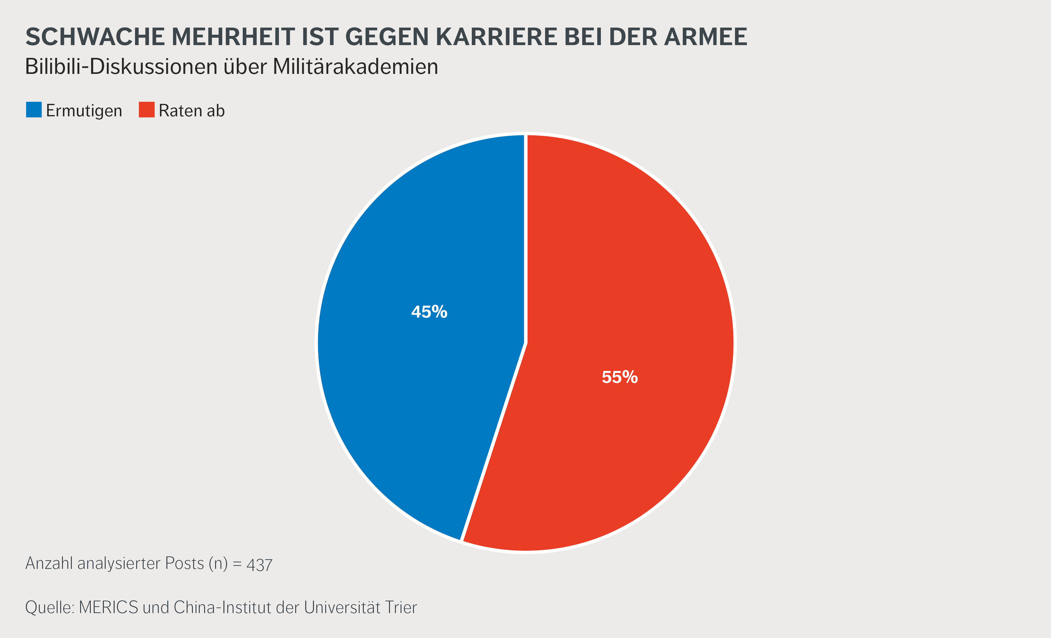 Für diese Analyse wurden auf der Videoplattform Bilibili die 29 Videos mit Bezug zur Militärakademie ausgewählt, die die höchste Zuschauerbeteiligung aufwiesen. Die Kommentare unter diesen Videos, die mehr als 21 chinesische Zeichen umfassten, wurden einer Themenmodellierung unterzogen. Aus der Themenmodellierung gingen 51 Themen hervor, wobei prominente Themen ein klares dichotomes Muster aufwiesen: Kommentare „ermutigten“ entweder oder „rieten davon ab“, dem Militär beizutreten. Nach Überprüfung und Entfernung redundanter Inhalte blieben zwölf Themen übrig, zu denen es insgesamt 755 Kommentare gab. Mit Hilfe von OpenAI wurde jeder gepostete Kommentar mit einem der folgenden Tags versehen: „ermutigt“, „rät ab“ oder „unklar“. Chat GPT wurde aufgefordert, mehrere Gründe anzugeben, warum ein Kommentar mit „ermutigt“ oder „rät ab“ gekennzeichnet wurde. Die Richtigkeit wurde manuell überprüft. Der Tag-Vorgang wurde einmal wiederholt und anschließend wurden sich überschneidende Beweggründe unter „ermutigt“ und „rät ab“ zusammengeführt. Die wichtigsten Gründe für und gegen eine Karriere beim Militär, die sich aus der Themenmodellierung ergaben, werden in dieser Analyse dargelegt.
