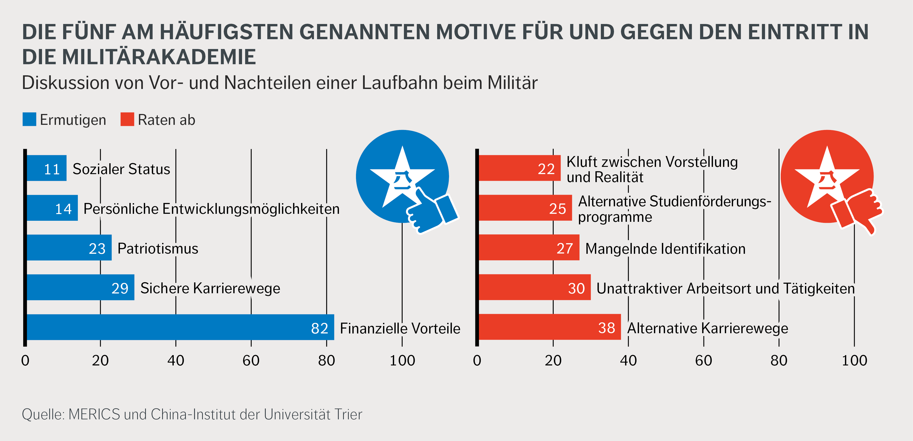 Die Armee bemüht sich um die besten Nachwuchskräfte des Landes. In Online-Diskussionen zum Thema wird eine militärische Laufbahn jedoch durchaus kontrovers diskutiert. Während manche finanzielle Stabilität und Patriotismus als positive Beweggründe anführen, verweisen andere auf systemische Probleme und unsichere Perspektiven im Militär. Für die vorliegende Analyse haben wir die Kommentare zu 29 Videos über Chinas Militärakademien nach Gründen für und gegen den Eintritt in die VBA analysiert. Die Videos enthalten Ratschläge und Einblicke von pensionierten Offizieren, motivierende und inspirierende Geschichten und Erfahrungen, pädagogische Inhalte sowie praktische Informationen zum Bewerbungsverfahren.
