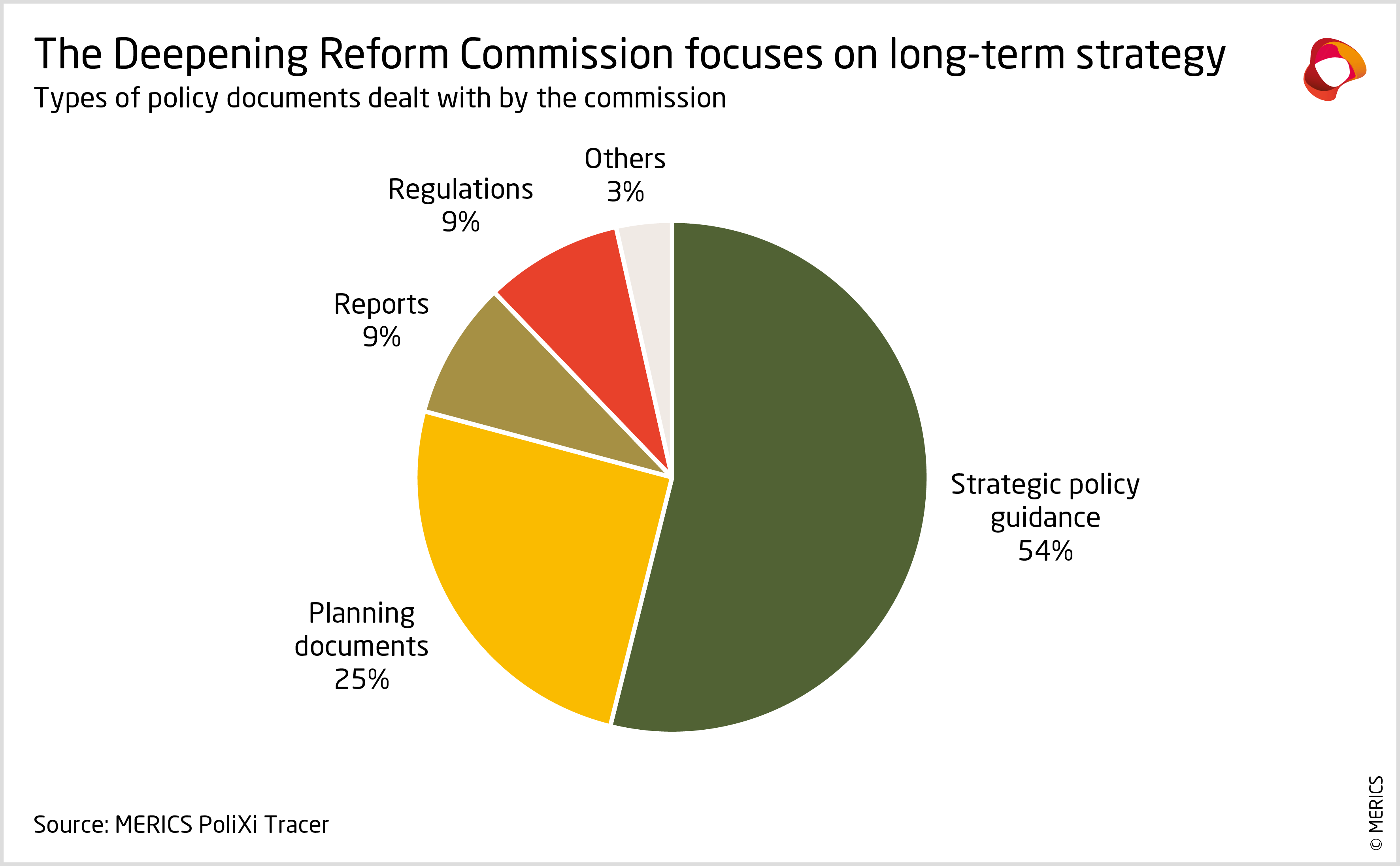 The Commission for Comprehensively Deepening Reform is directly involved in shaping China’s future development in the policy areas it covers. Over seventy-five percent of its policy documents concern policy guidance or long-term plans. These documents outline broad requirements, but rarely put forward concrete measures or targets; the implementing agencies are left to figure out the details. A network of CCDR mirror organizations in governments down to the county level, as well as large state-owned enterprises (SOEs), then oversees the detailed implementation of policy guidance and plans at local levels.