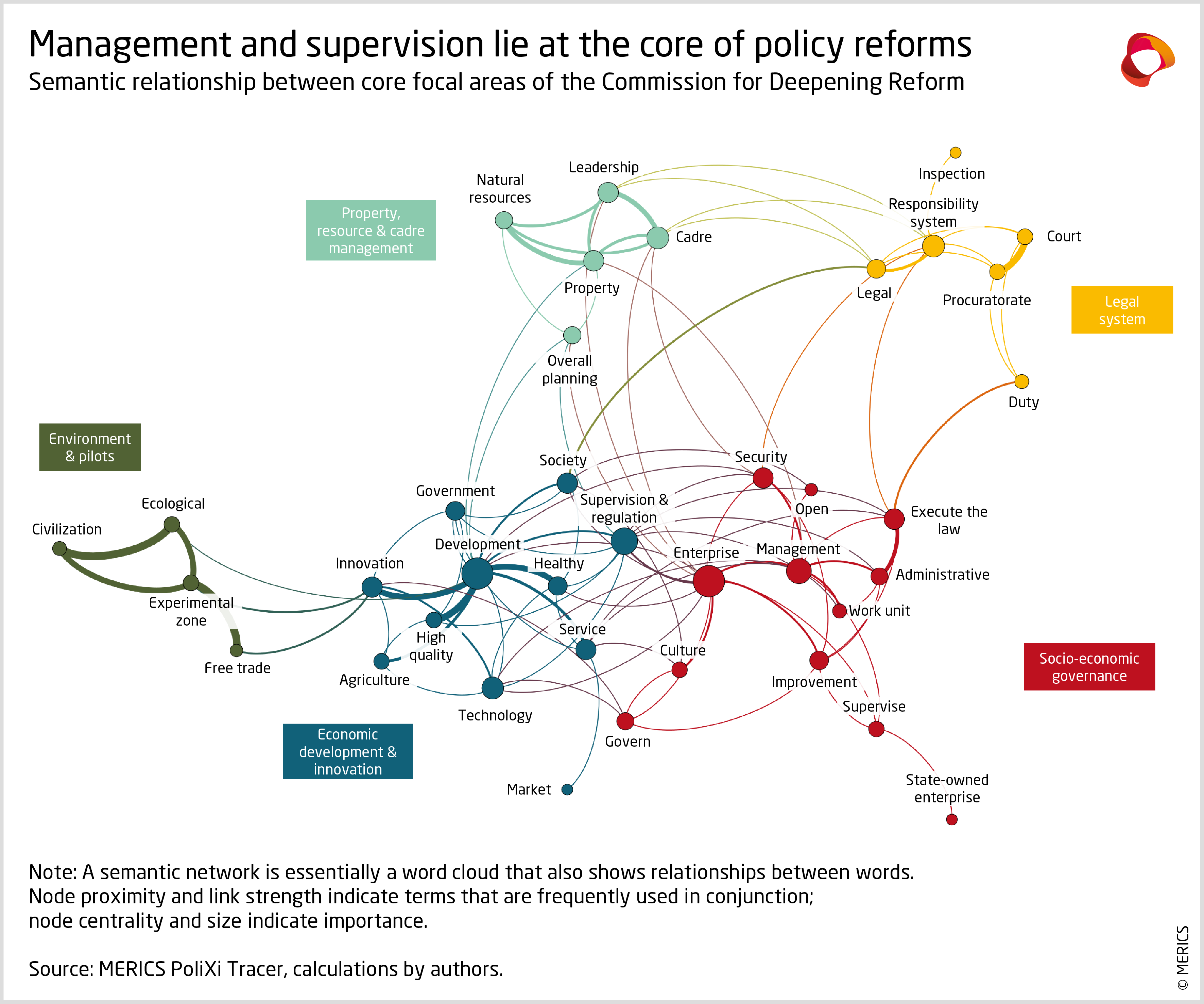The policy areas covered by the CCDR reflect the broad scope of its founding document, the 2013 Decisions, and include party organization as well as structural socio-economic and legal reforms. The diagram below, based on the content of CCDR-deliberated policies, shows the semantic relationship between these different core focal areas. Frequently mentioned and occupying a central position in the network are issues such as supervision, management, and “healthy development” – a policy euphemism for the prioritization of government-guided long-term development over short-term corporate interests.