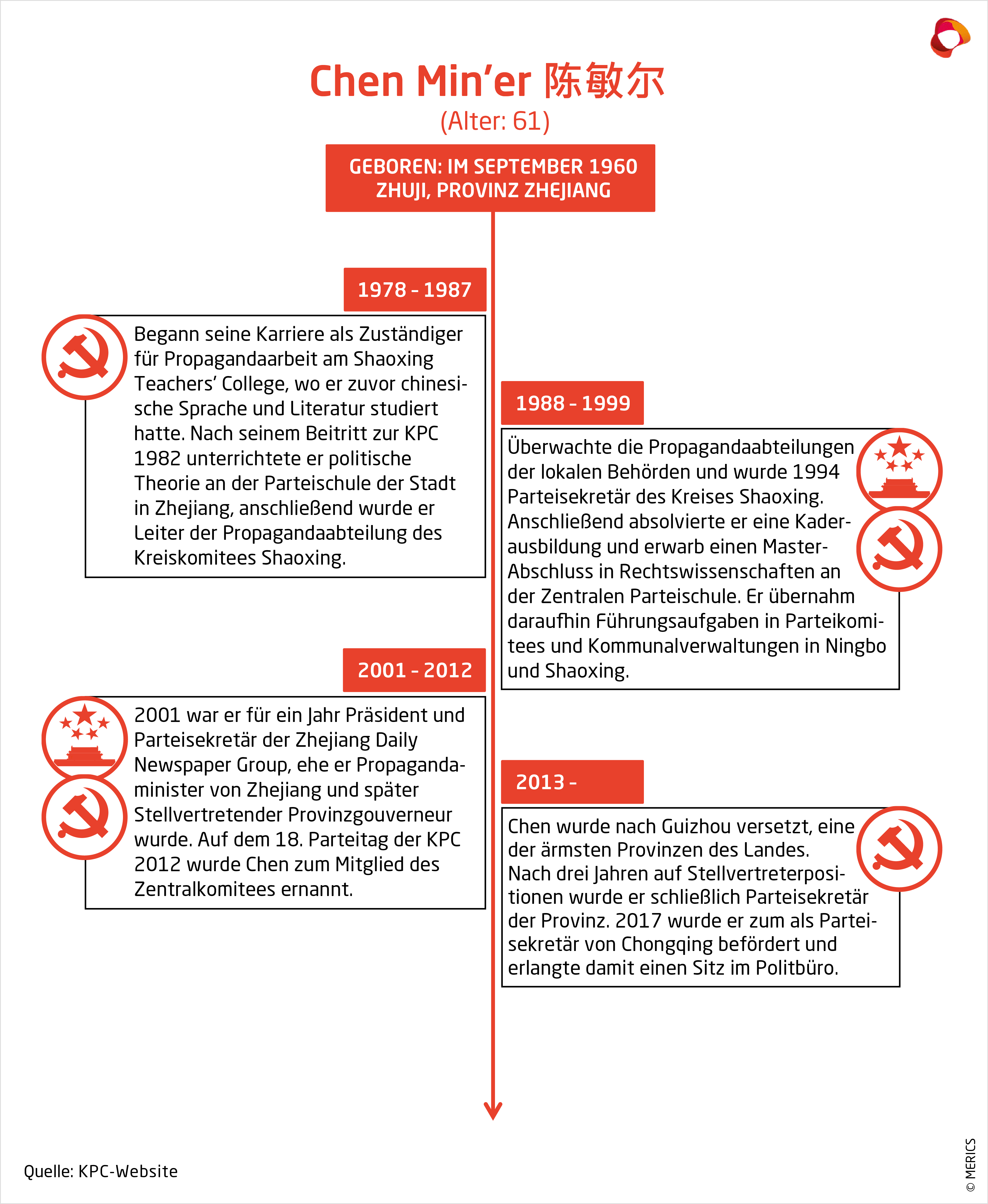 Chen Min'er könnte auf dem Parteitag der Kommunistischen Partei Chinas (KPC) Ende des Jahres in die Riege der sieben mächtigsten Personen Chinas aufsteigen. Chen, derzeit Parteisekretär von Chongqing und Politbüro-Mitglied, ist einer der Anwärter auf einen Sitz im Ständigen Ausschuss des Politbüros. Für dessen Vorsitzenden Xi Jinping arbeitete er bereits vor 20 Jahren. Xi griff in seiner Zeit als Parteisekretär von Zhejiang auf das Fachwissen und die Erfahrung des damaligen Propagandachefs der Provinz zurück. Chen half Xi dabei, unter einem Pseudonym Kolumnen in der zeitweise von ihm geleiteten Parteizeitung Zhejiang Daily zu veröffentlichen.