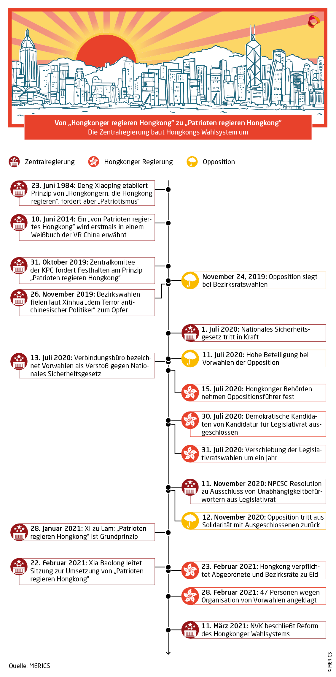 MERICS-Analyse: Das Prinzip eines "von Patrioten regierten Hongkong" wurde zuletzt in parteistaatlichen Medien vermehrt erwähnt und auf eine Rede von Deng Xiaoping von 1984 zurückgeführt, die als Grundlage für das Prinzip "Ein Land, zwei Systeme" gilt. So wird der Eindruck erweckt, dass der Anspruch unbedingter Loyalist gegenüber der Volksrepublik und der KPC schon immer galt. Hiermit versucht Beijing zu widerlegen, dass die „Gemeinsame Erklärung“ Großbritanniens und Chinas von 1997 sowie das Hongkonger Grundgesetz ein allgemeines Wahlrecht und eigenständiges politisches System vorsahen.
