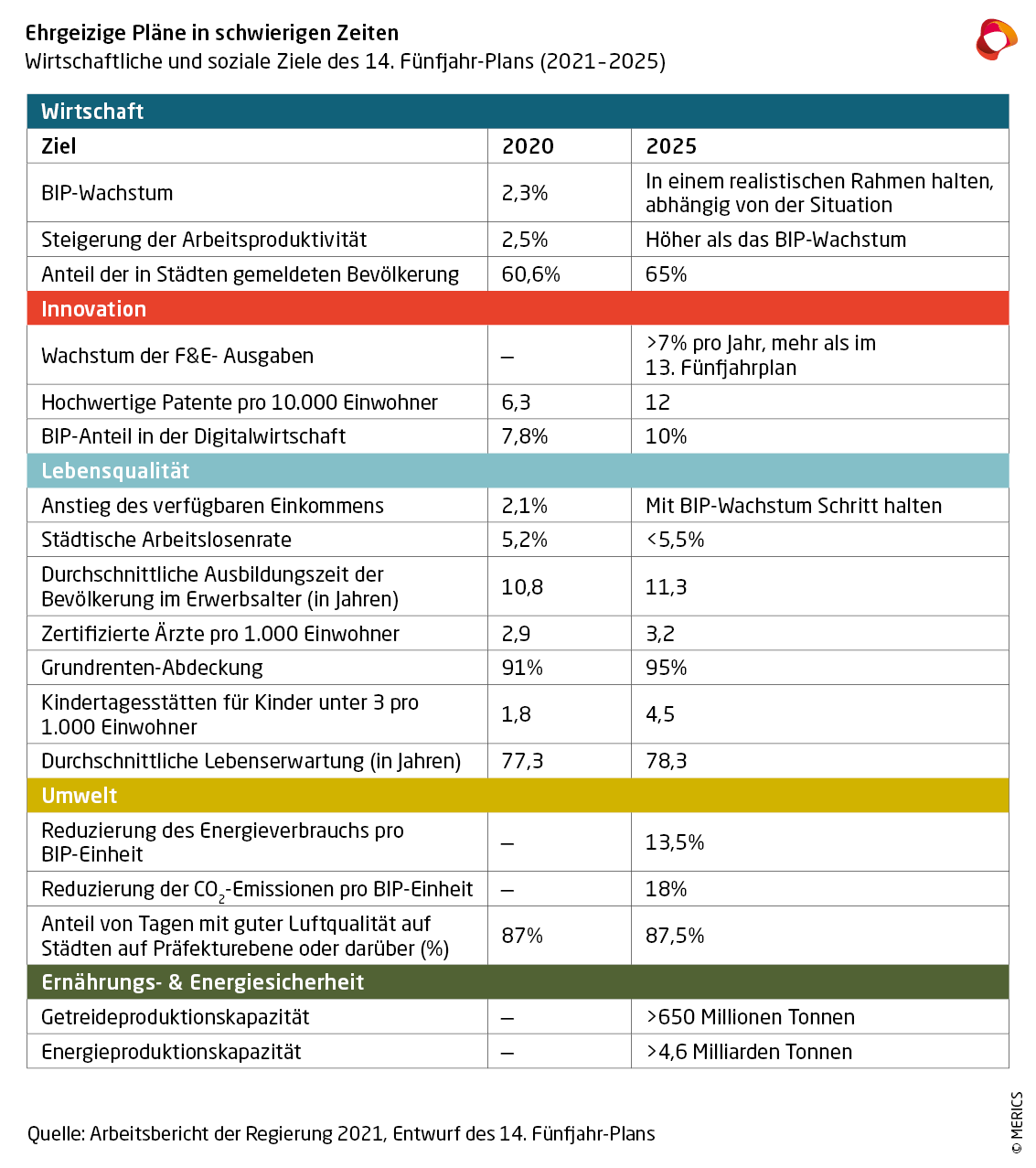 Der 14. Fünfjahr-Plan misst der wissenschaftlichen und technologischen Eigenständigkeit strategische Bedeutung für Chinas Entwicklung bei. Dennoch stehen große Herausforderungen bevor. In der Grundlagenforschung hat China Schwächen, bei Kerntechnologien, wie etwa integrierten Schaltkreisen, ist die Abhängigkeit vom Ausland immer noch hoch. Da die US-Handelsbeschränkungen Chinas technologische Ambitionen behindern, ist die Reform des Innovationssystems und der Forschungsinfrastruktur des Landes eine Priorität.