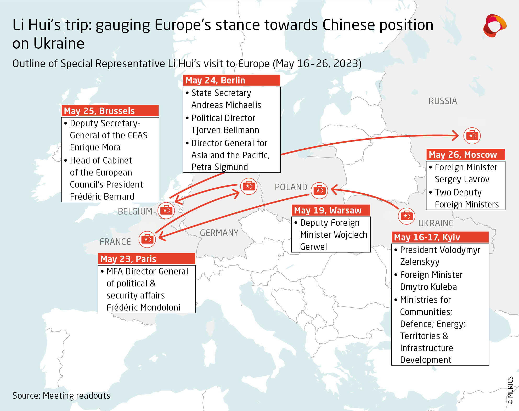 - Gauging Europe: By sending Li Hui – an experienced diplomat and former ambassador to Russia, but still not a key foreign policy figure – Beijing sought to test the water on the “Ukraine crisis” rather than engage in meaningful dialogue. Throughout the visit, Li primarily reinforced the Chinese points from the February position paper and gauged the reactions of European counterparts.