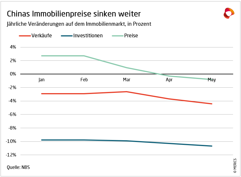 Chinas Immobiliensektor zeigt keine Anzeichen einer Erholung. Der jährliche Rückgang der Immobilienpreise beschleunigte sich von 0,3 Prozent im April auf 0,8 Prozent im Mai, während die Verkaufszahlen um 4,4 Prozent gegenüber 3,7 Prozent zurückgingen. Die Investitionen sanken um 10,7 Prozent. Dennoch konzentrierte sich der Staatsrat auf einer Sitzung unter Vorsitz von Premier Li Qiang am 13. Juni ausschließlich auf die „Stabilisierung und Eindämmung” des Niedergangs des Sektors und nicht auf Konjunkturmaßnahmen. Beijing ist zwar besorgt über die wirtschaftlichen Auswirkungen der Immobilienkrise, will aber zur Belebung des Marktes nicht auf staatliche Ausgaben zurückzugreifen.