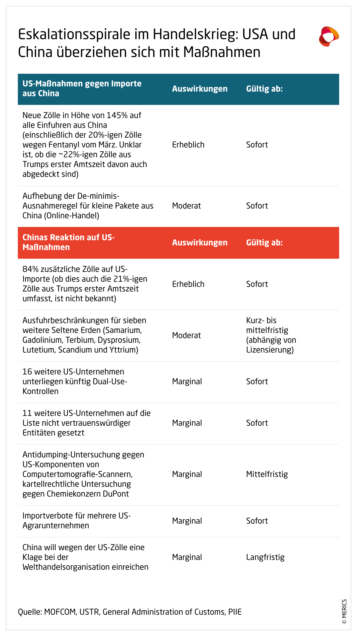 Die Welt blickt gespannt auf China und die Frage, ob Beijing weitere Gegenmaßnahmen ergreifen wird. Auch wenn ein Nachgeben gegenüber Trump unwahrscheinlich ist, dürfte Beijing sehr an einer Verhandlungslösung gelegen sein – allerdings nur aus einer Position der Stärke heraus. China hat immer noch Möglichkeiten, die USA empfindlich zu treffen: Es könnte den Handel mit Dienstleistungen ins Visier nehmen, bei dem die USA einen Überschuss gegenüber China aufweisen. China könnte auch auf die Exportkontrollen zurückgreifen, die es zuletzt schon in Regulierungen ausgeweitet hatte, und Exporte in die USA und andere Länder auch de facto blockieren. Und es könnte die Schrauben bei US-Investoren in China anziehen. Doch sind solchen Schritten auch Grenzen gesetzt, da diese Unternehmen in China zum dringend benötigten Wachstum, der Schaffung von Arbeitsplätzen und Steuereinnahmen beitragen.