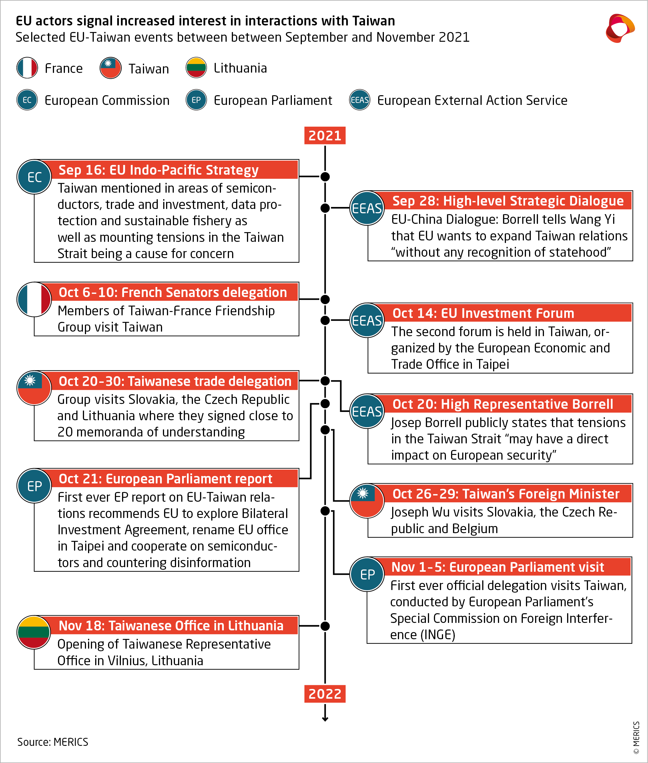 Multiple European actors have recently shown increased support for engagement with Taiwan. The European Parliament and national MPs held meetings with the Taiwanese Foreign Minister, a Taiwanese trade delegation toured Central and Eastern Europe, while the European Parliament and Commission released policy documents linked to EU-Taiwan relations.