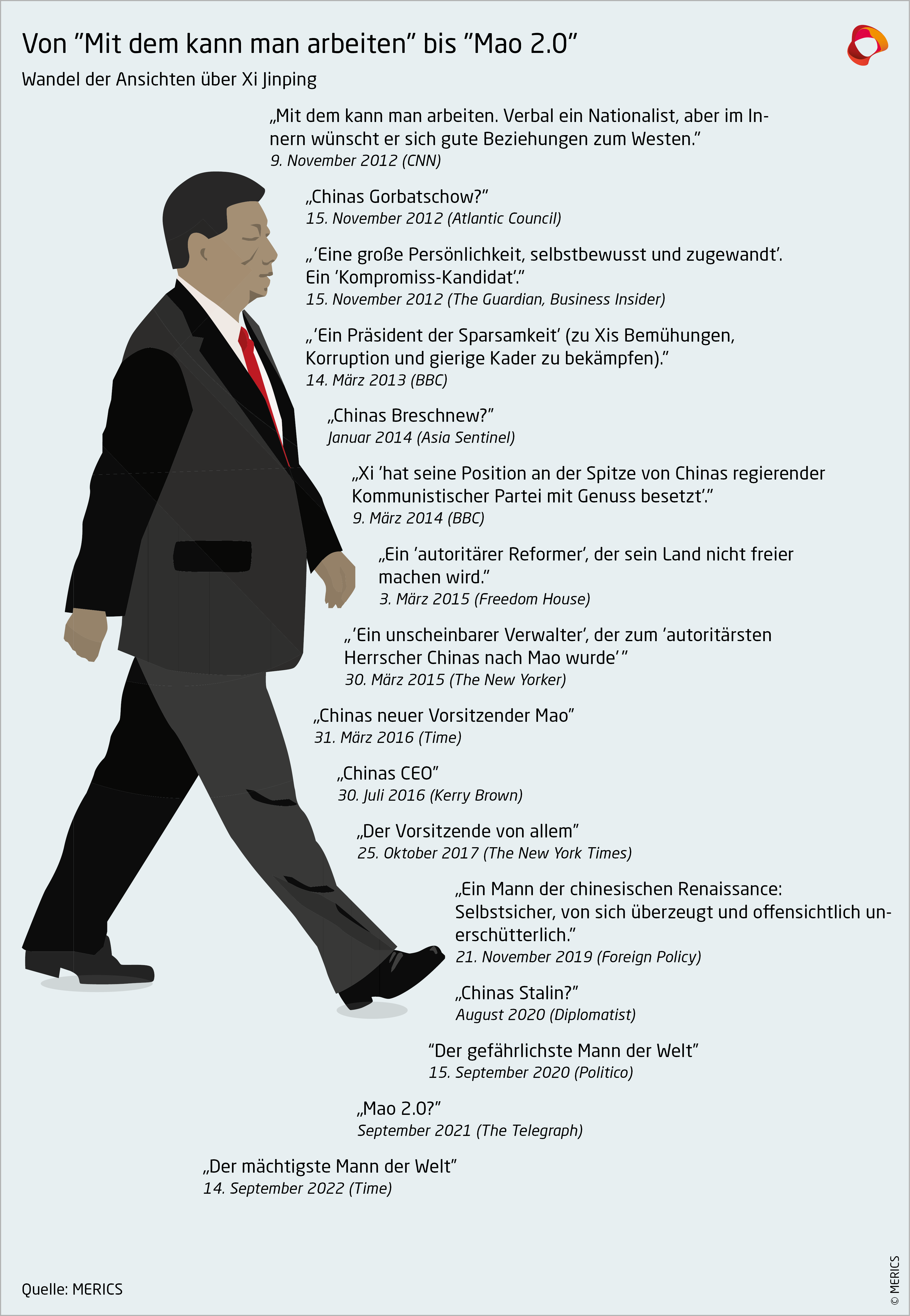 MERICS Analyse: „Xi wird in seiner Eröffnungsrede den Ton für die nächsten fünf Jahre setzen. Er wird seine Ziele bekräftigen: ideologiegetriebene Politik, mehr Autorität für die Partei und mehr internationale Schlagkraft und Selbstständigkeit für China", sagt Nis Grünberg, Lead Analyst bei MERICS. „Der Parteitag der KPC wird eine Krönungszeremonie für Xi und seine Ideologie, und gleichzeitig steht aber China vor den größten Herausforderungen seit Jahrzehnten. Obwohl Millionen Menschen im Lockdown sind und sich die sozioökonomischen Probleme häufen, will der Parteitag eine siegesgewisse Botschaft senden."