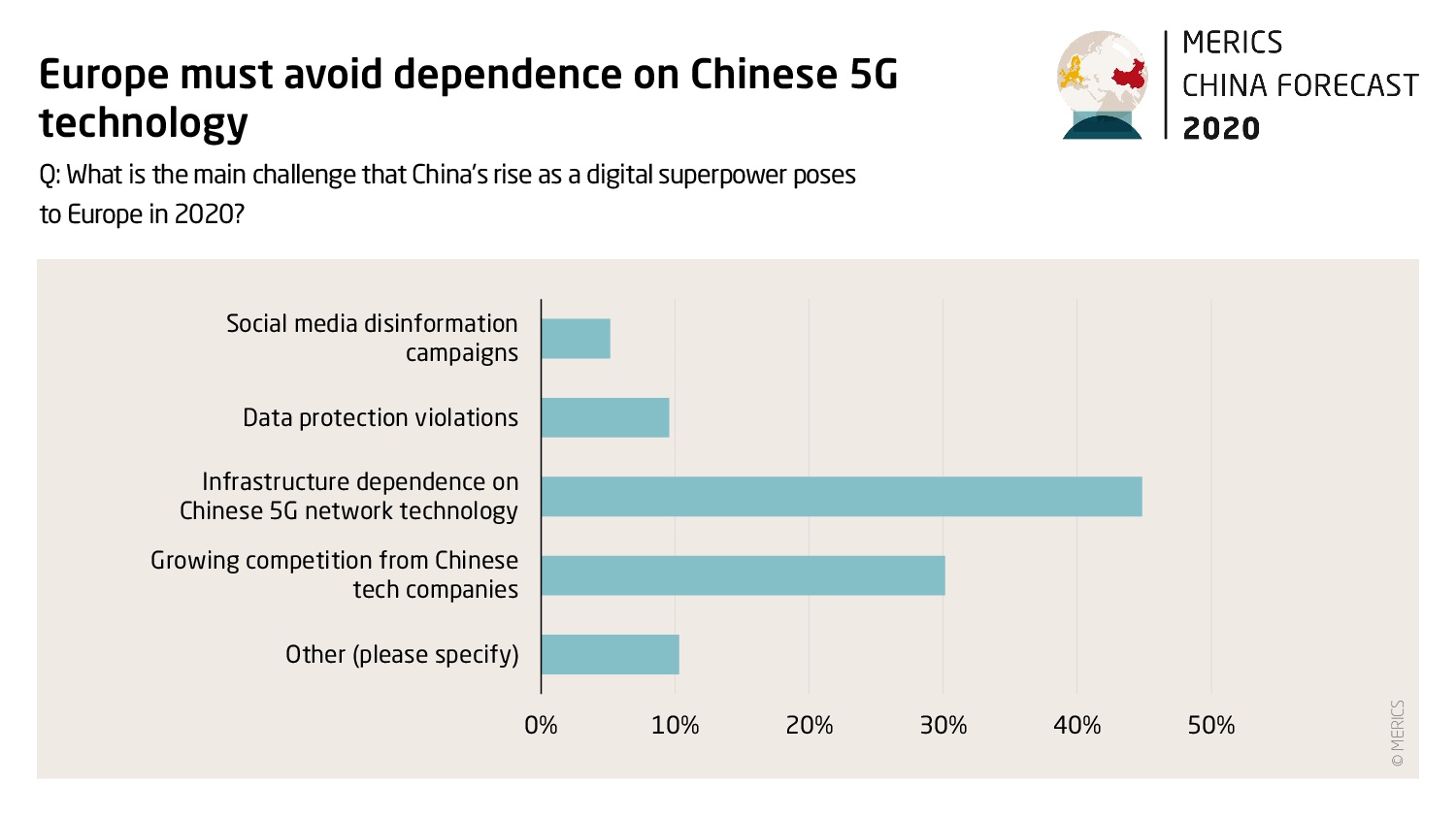 Rund 45 Prozent der Befragten sind der Ansicht, dass Europas Abhängigkeit von chinesischer 5G-Technologie die größte Herausforderung darstellt, die mit Chinas Aufstieg zur Digitalmacht einhergeht. 43 Prozent halten es wiederum für notwendig, die europäische Industriepolitik zu überarbeiten, um künftig besser mit Chinas Staatskapitalismus mithalten zu können (26 Prozent fordern eine Veränderung in der Forschungs- und Innovationspolitik, 15 Prozent einen Wechsel in der Handelspolitik und nur sieben Prozent eine überarbeitete Menschenrechtspolitik).