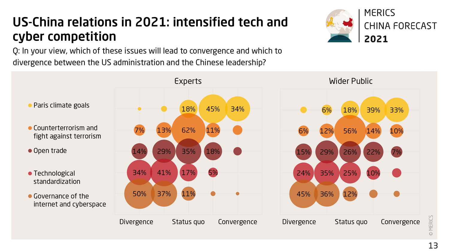 Die Beziehungen zwischen den USA und China haben sich in den letzten Jahren stetig verschlechtert. Für 2021 erwarten die Befragten einen verschärften Technologie- und Cyber-Wettbewerb zwischen den beiden Großmächten. Gleichzeitig könnte es dieses Jahr zu einer Wiederbelebung der transatlantischen Partnerschaft kommen: 88 Prozent der China-Experten und 82 Prozent der befragten breiteren Öffentlichkeit rechnen mit einer Annäherung der EU und ihrer Mitgliedsstaaten an die USA unter einer Regierung Biden. Und wie sieht es mit den deutsch-chinesischen Beziehungen aus? Im September sind in Deutschland Bundestagswahlen. Nach der Ära Angela Merkel wird keine Lockerung der Haltung gegenüber Beijing erwartet. Fast 50 Prozent der befragten China-Experten gehen davon aus, dass Berlin anschließend eine härtere Gangart gegenüber China einschlagen wird.