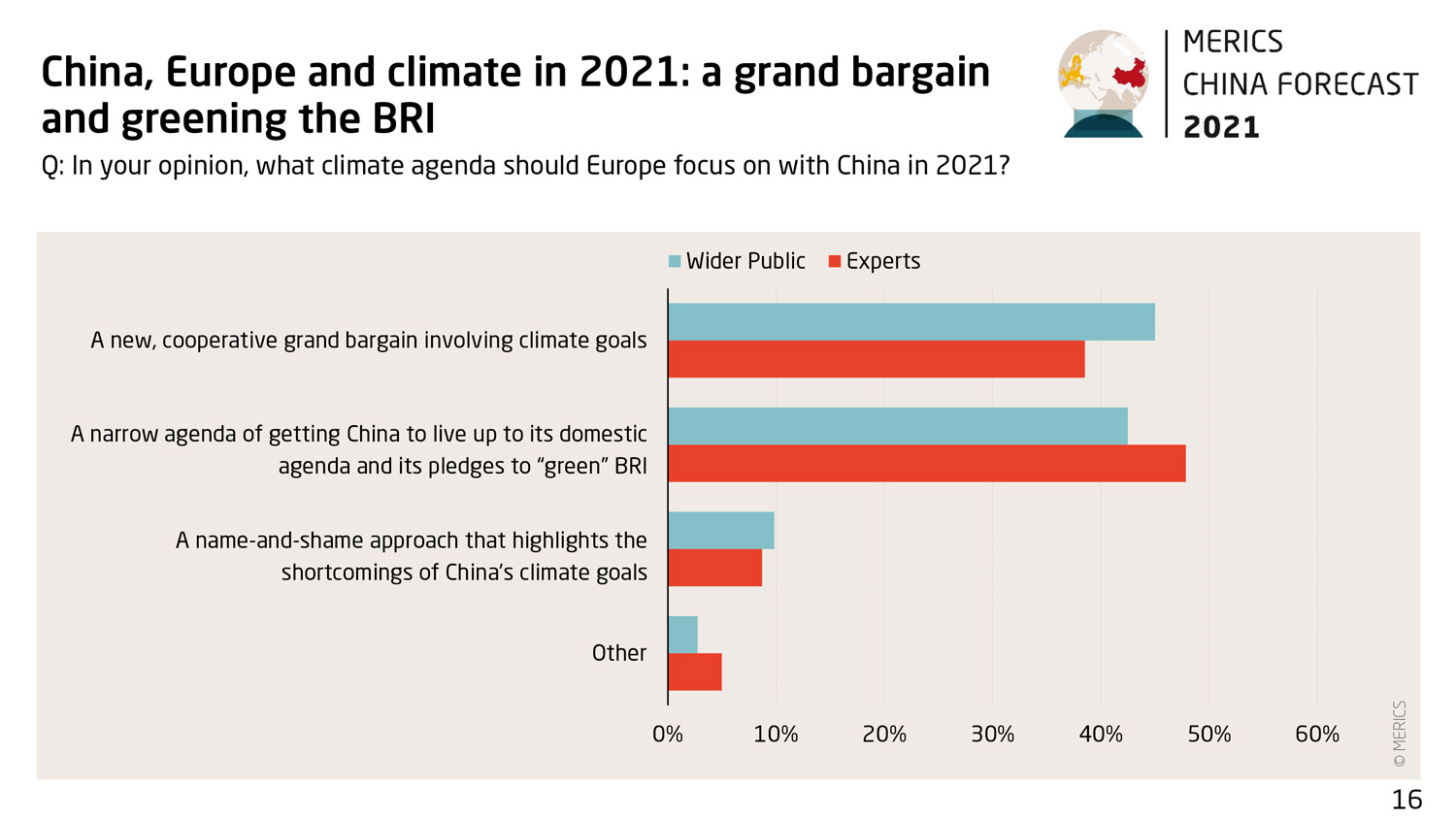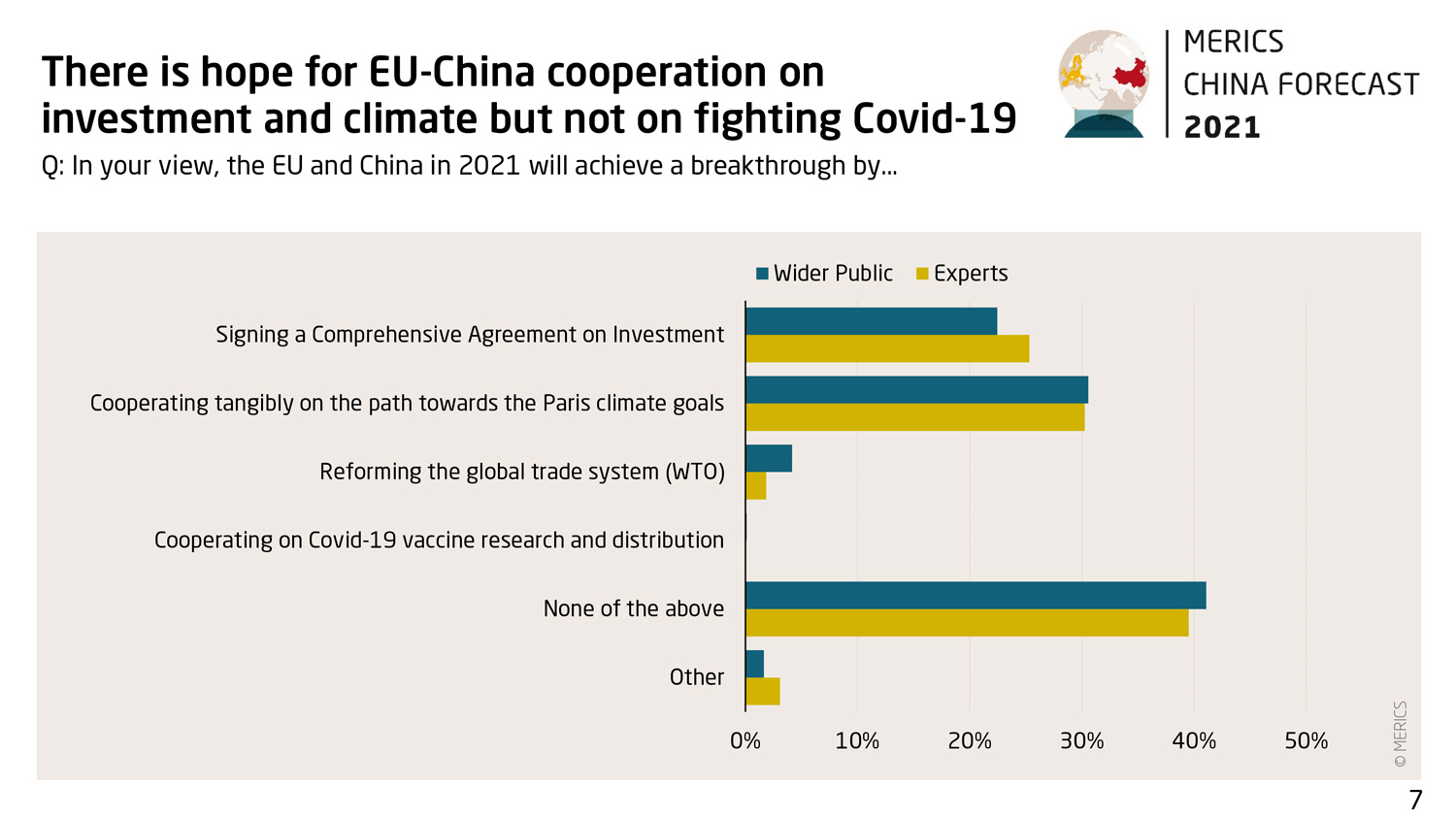 Zusammenarbeit im Bereich der öffentlichen Gesundheit? Die Umfrageteilnehmer sind pessimistisch. Keiner der befragten Experten oder Bürger sieht in der gemeinsamen Erforschung und Verteilung von Impfstoffen einen Bereich, in dem die EU und China einen Durchbruch erzielen können. Hoffnung setzen die Befragten dagegen auf die Klimapolitik. Fast 40 Prozent der Experten und 45 Prozent der Befragten aus der breiten Öffentlichkeit sind der Meinung, dass Europa sich auf ein neues gemeinsames Abkommen mit China konzentrieren sollte, das Klimaziele beinhaltet. Hier könnten greifbare Ergebnisse schneller erreicht werden.