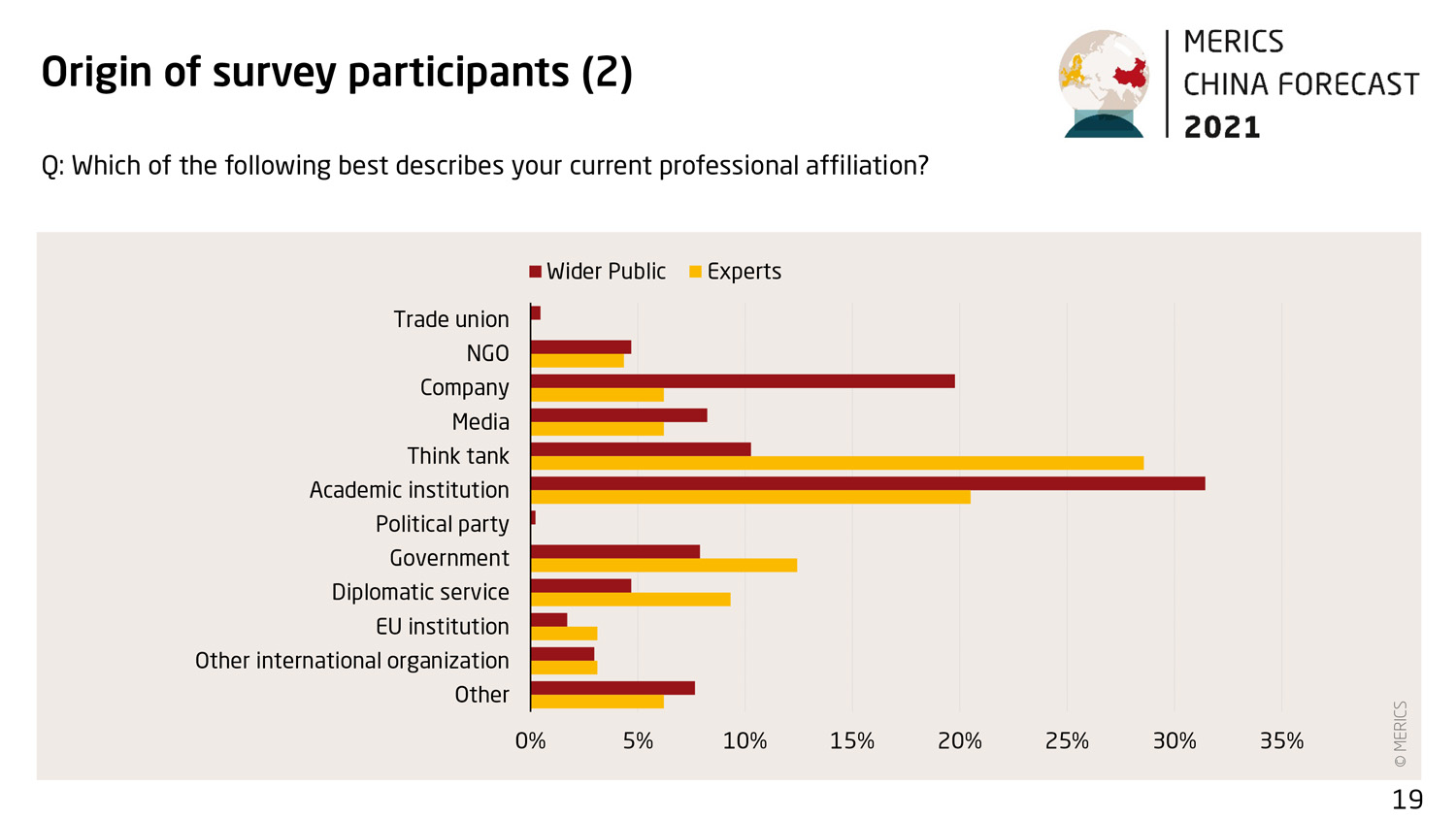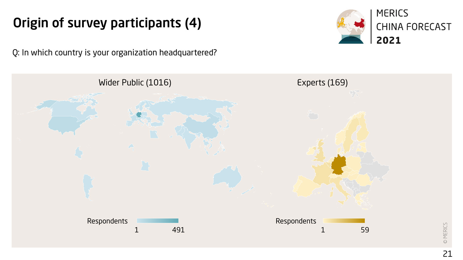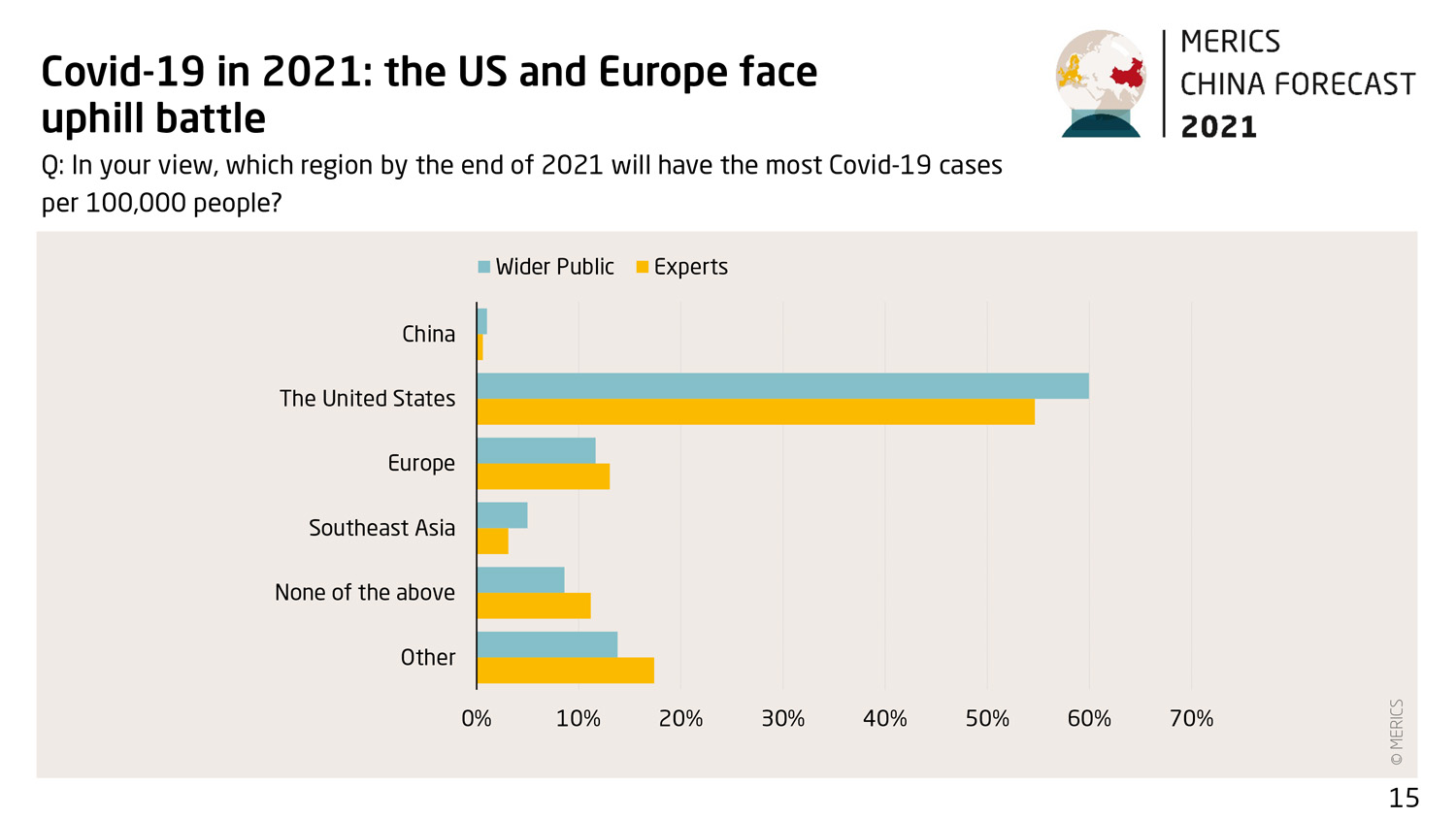 Um herauszufinden, wie die Beziehungen zwischen der EU und China nach Meinung von Beobachtern im Jahr 2021 aussehen werden, führte MERICS eine Umfrage unter 170 europäischen China-Experten und rund 1.000 Mitgliedern der breiteren internationalen Öffentlichkeit durch. Eine Auswahl der Ergebnisse wurde am 13. Januar 2021 auf der MERICS China Forecast 2021 Konferenz vorgestellt und von führenden China-Spezialisten diskutiert.