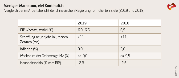 Der chinesische Premier korrigierte erwartungsgemäß die Ziele für das BIP-Wachstum 2019 (von rund 6,5 Prozent im Vorjahr) auf sechs bis 6,5 Prozent nach unten. Dies dürften Regierungsvertreter auf allen Ebenen als Signal verstehen, dass es künftig darauf ankommt, die Wirtschaft stärker auf qualitatives Wachstum umzustellen. Zu diesem Ziel, und um die Arbeitslosigkeit so gering wie möglich zu halten, sollen vermehrt höher qualifizierte Jobs geschaffen werden, die zum Erhalt der Produktivität in einer alternden Gesellschaft beitragen.