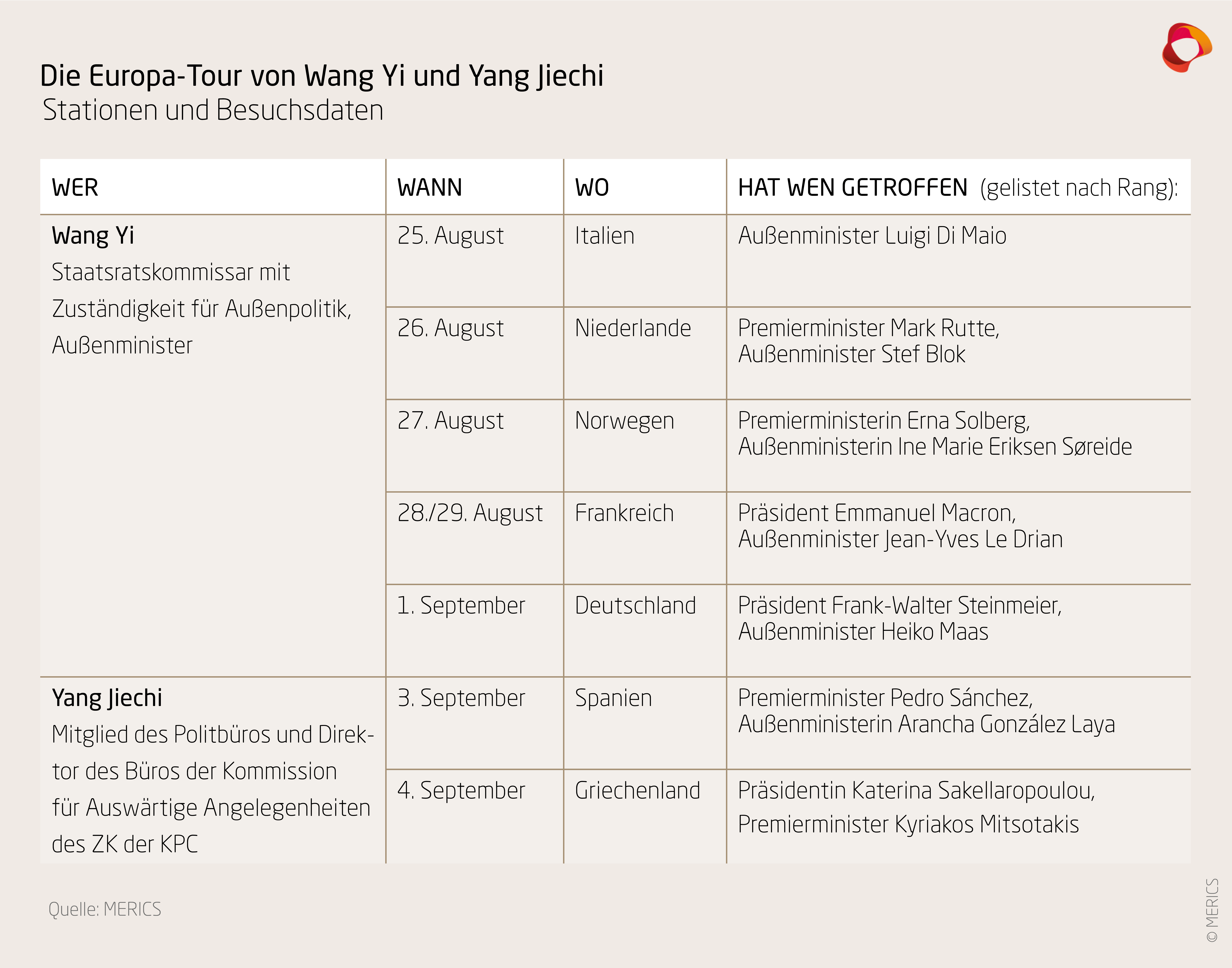 Auch Yang Jiechi hörte bei seinen Besuchen in Griechenland und Spanien nicht nur so positive Worte, wie es chinesische Diplomaten in Europa zuletzt gewöhnt waren. In der offiziellen spanischen Erklärung zu Yangs Besuch wurde das Thema Sicherheit von 5G-Netzen ebenso angesprochen wie Chinas Vorgehen in Hongkong und im Südchinesischen Meer.